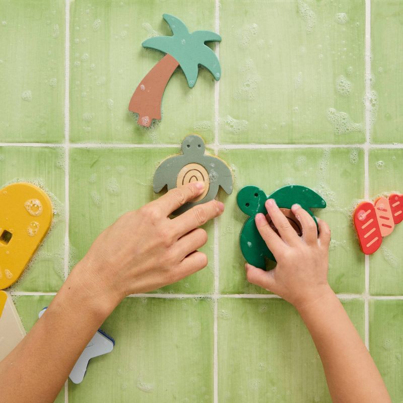 - A splash of island fun: Foam pieces float and stick to bath walls for hands-on island adventures.