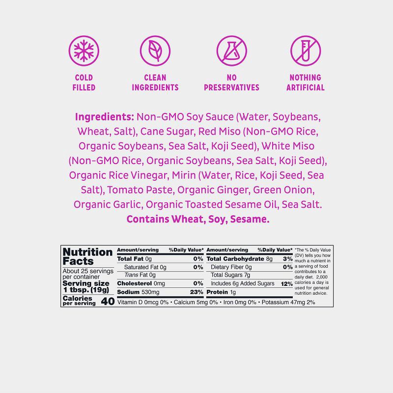 Non-GMO Soy Sauce (Water, Soybeans, Wheat, Salt), Cane Sugar, Red Miso (Non-GMO Rice, Organic Soybeans, Sea Salt, Koji Seed), White Miso (Non-GMO Rice, Organic Soybeans, Sea Salt, Koji Seed), Organic …