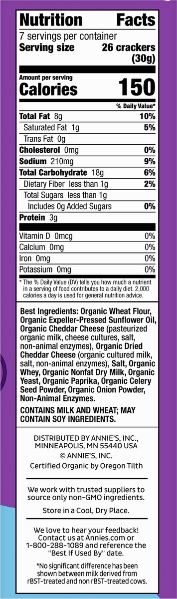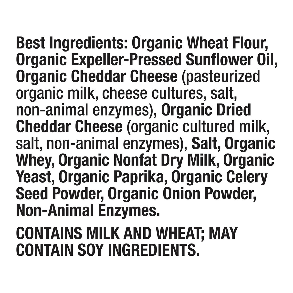 Best Ingredients: Organic Wheat Flour, Organic Expeller-Pressed Sunflower Oil, Organic Cheddar Cheese (Pasteurized Organic Milk, Cheese Cultures, Salt, Non-Animal Enzymes), Organic Dried Cheddar Chees…