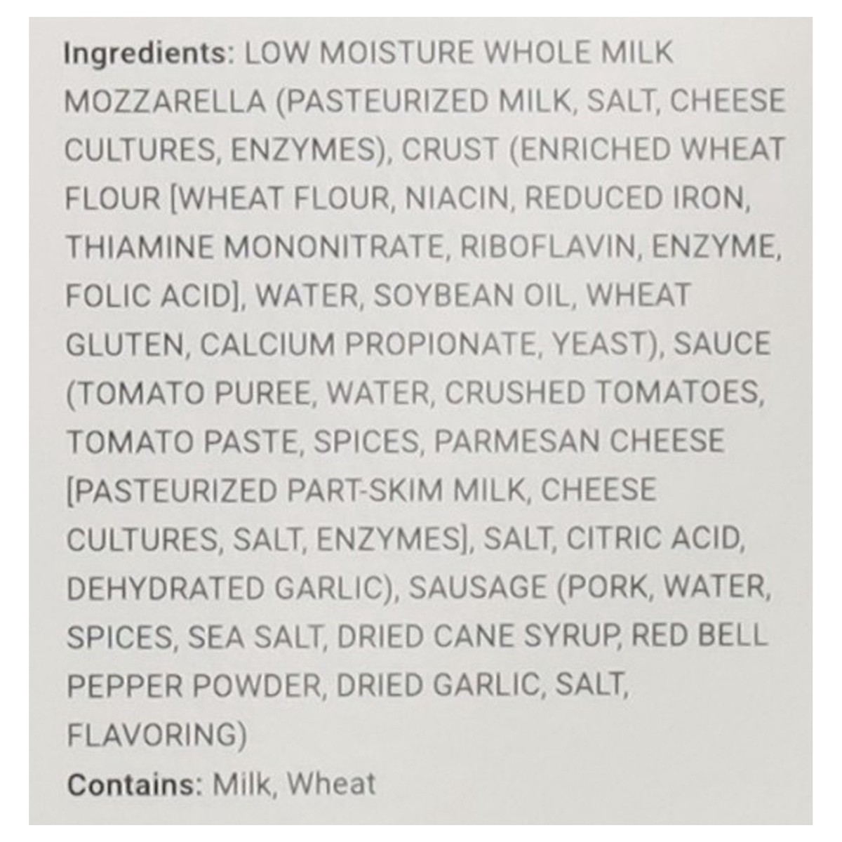 Low Moisture Whole Milk Mozzarella (Pasteurized Milk, Salt, Cheese Cultures, Enzymes), Crust (Enriched Wheat Flour [Wheat Flour, Niacin, Reduced Iron, Thiamine Mononitrate, Riboflavin, Enzyme, Folic A…