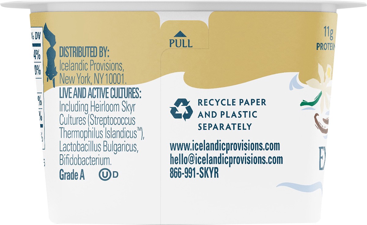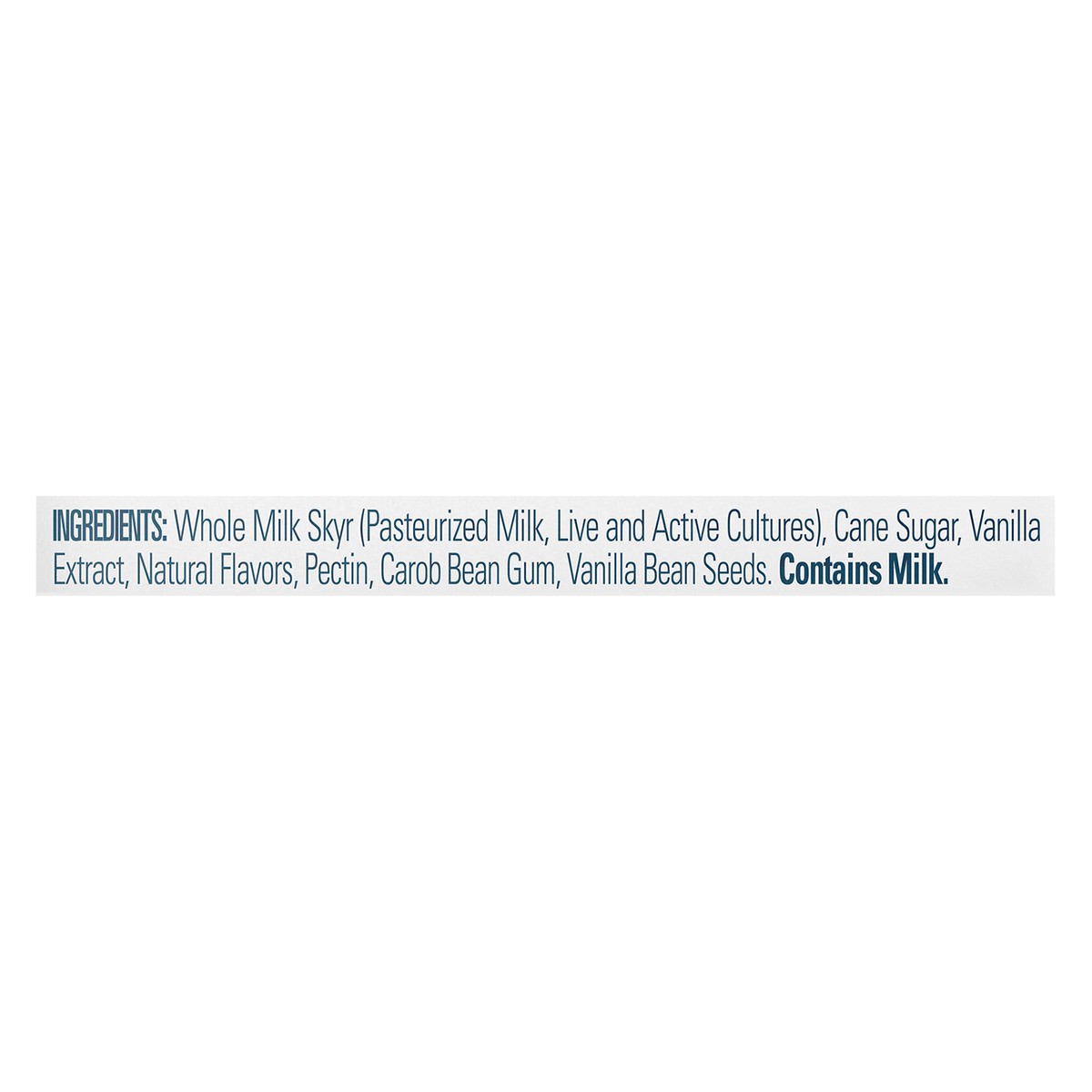 Whole Milk Skyr (Pasteurized Milk, Live and Active Cultures), Cane Sugar, Vanilla Extract, Natural Flavors, Pectin, Carob Bean Gum, Vanilla Bean Seeds, Live and Active Cultures: Including Heirloom Sky…