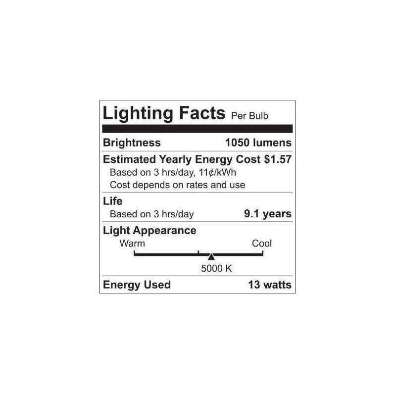 Brightness Quality: 1050 Lumens. Energy Info: 1.57 based on 3 hrs/day, 11 cents per kWh. Cost depends on rates and use. 13 Watts. Package Info: 2-Pack 2 Bulb Info: LED Medium. Bulb Life: 9.1 Years bas…