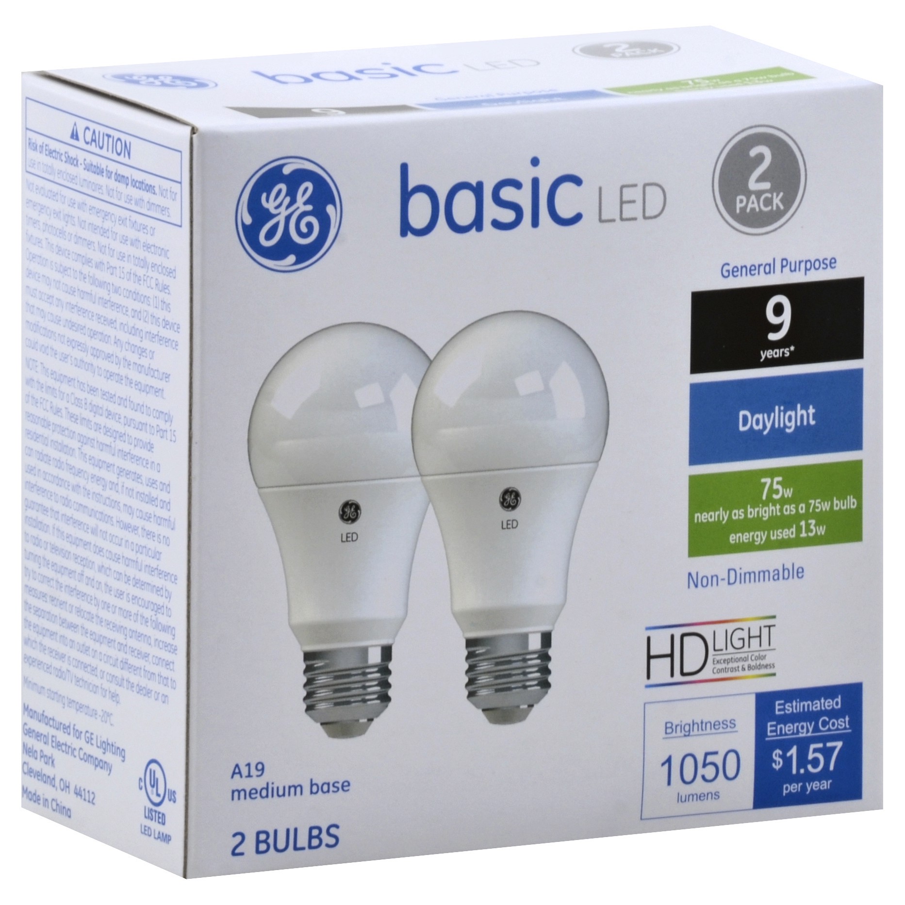 Brightness Quality: 1050 Lumens. Energy Info: 1.57 based on 3 hrs/day, 11 cents per kWh. Cost depends on rates and use. 13 Watts. Package Info: 2-Pack 2 Bulb Info: LED Medium. Bulb Life: 9.1 Years bas…