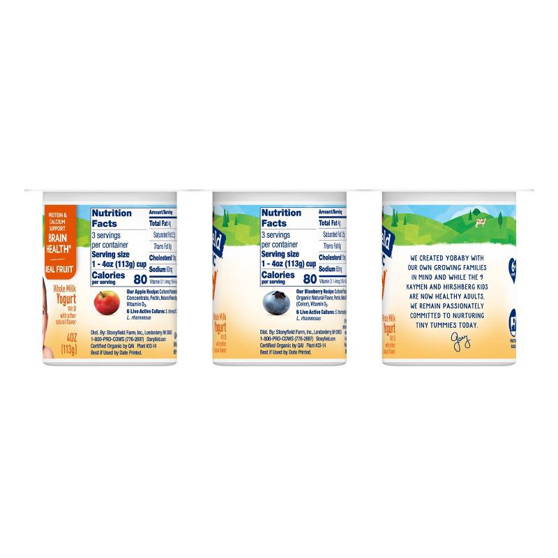 - Six 4 oz cups of Stonyfield Organic YoBaby Apple & Blueberry Whole Milk Baby Yogurt