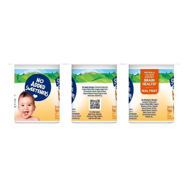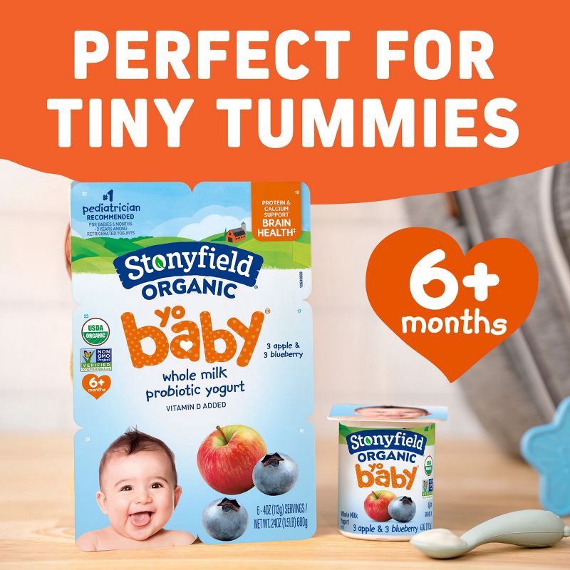 - Six 4 oz cups of Stonyfield Organic YoBaby Apple & Blueberry Whole Milk Baby Yogurt