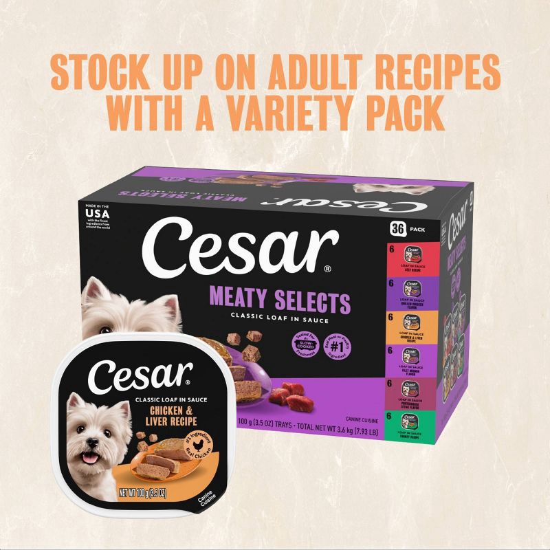 - Single: Contains one (1) 3.5 oz. easy-peel tray of Cesar Wet Dog Food Classic Loaf in Sauce Chicken and Liver Recipe.