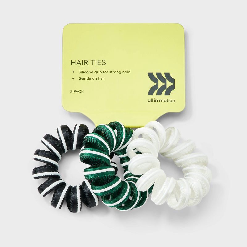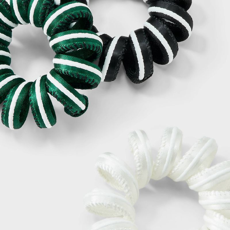 - Must-have features: 3 oversized spiral hair ties, fabric-covered layer in textured white, green-and-white and black-and-white patterns, silicone grip for strong hold, gentle on hair, suitable for all hair types, recommended for ages 15 years and above
