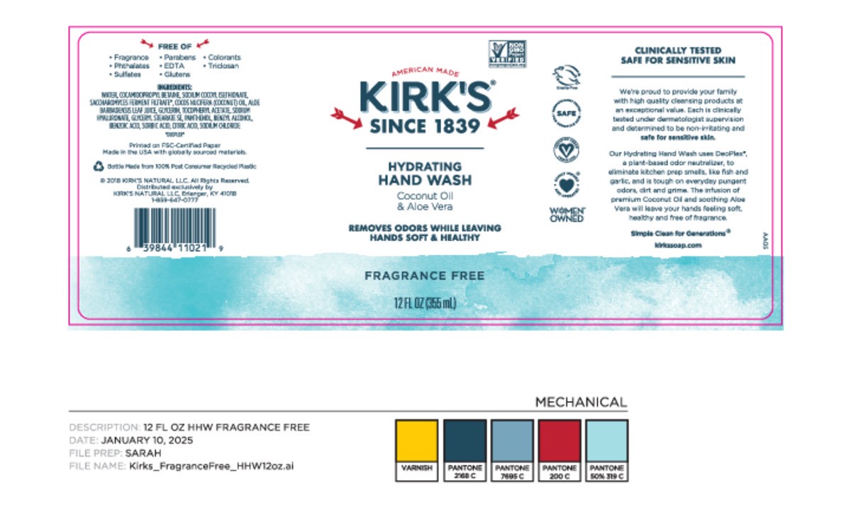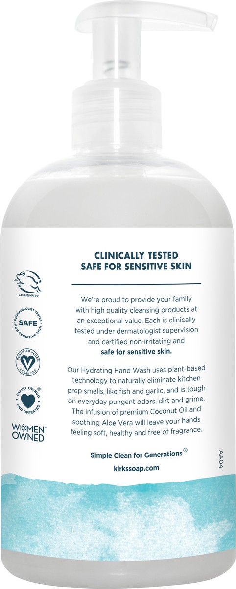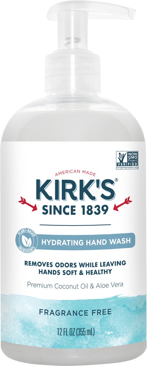 Kirk's Hydrating Hand Wash - for Men, Women & Children, Made with Coconut Oil and Aloe Vera, Non-GMO & Vegan, Fragrance Free, 12 Fl Oz.