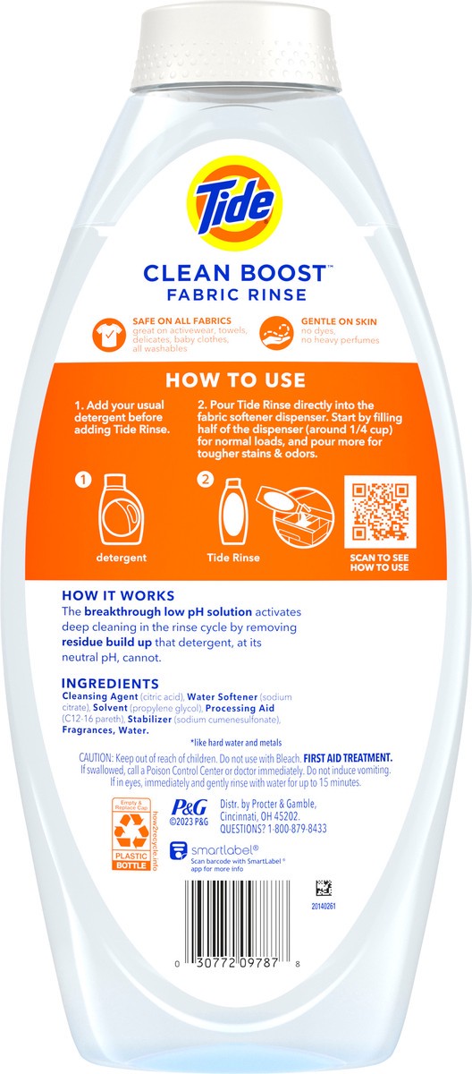 New Tide Clean Boost Fabric Rinse removes 3X trapped odors & residues from your laundry vs. detergent alone*. Tide Rinse has a unique low pH solution that breaks down residues from clothes that deterg…