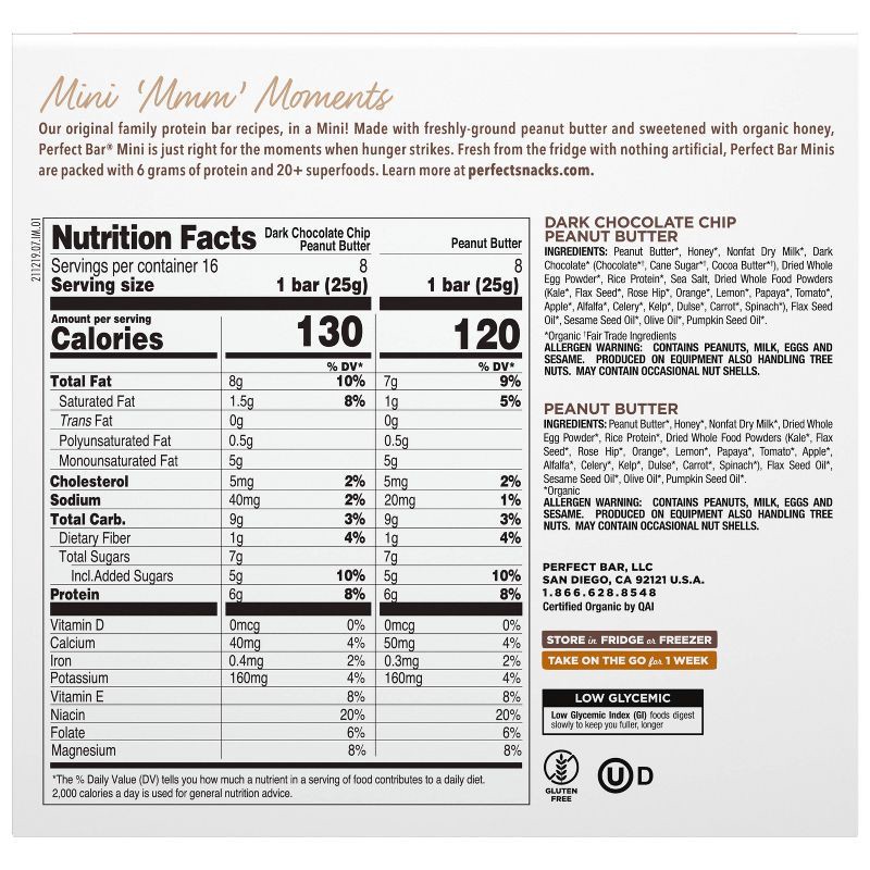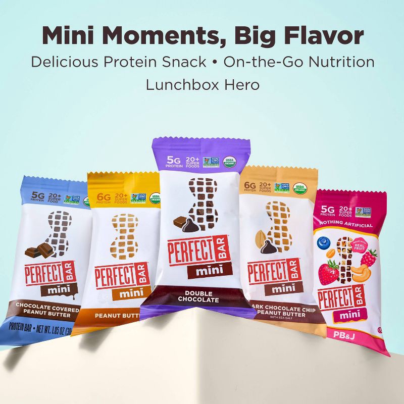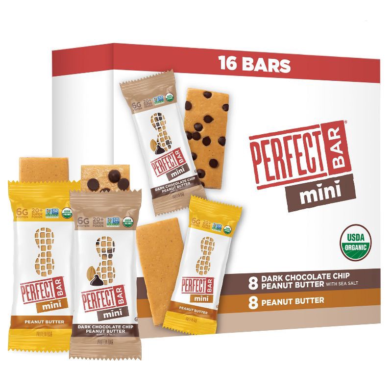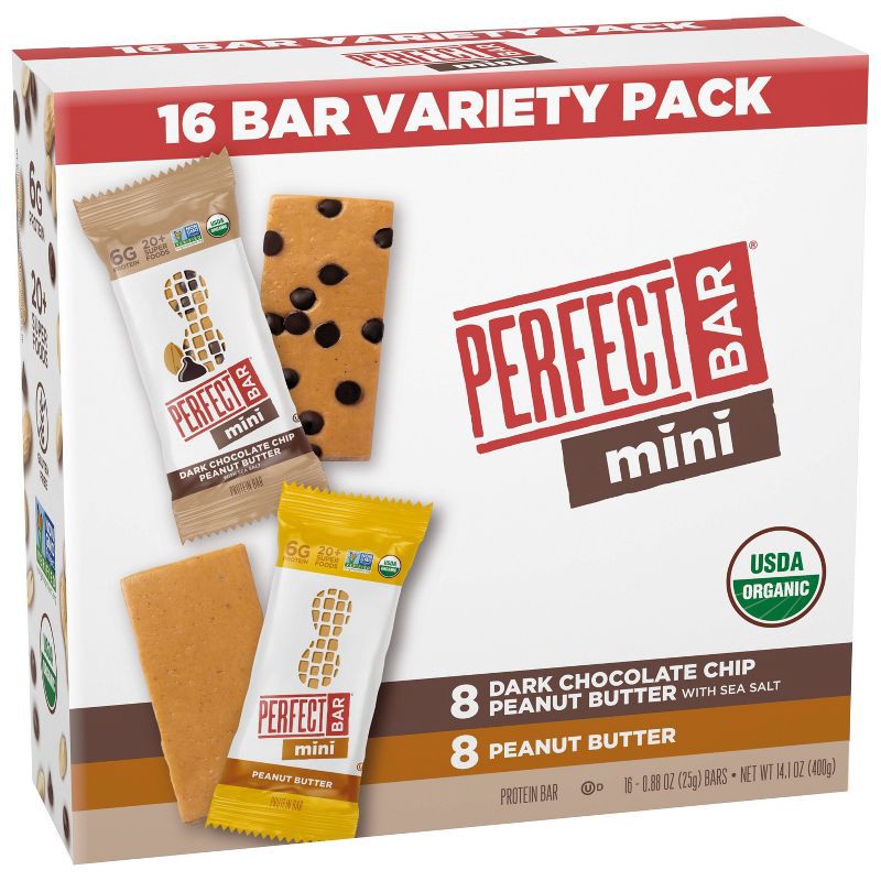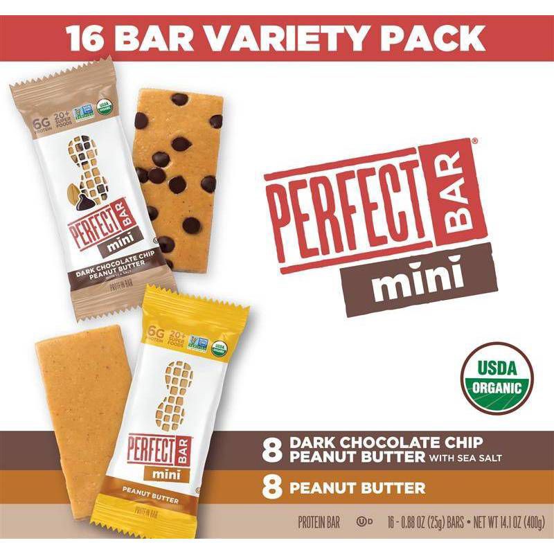 - PERFECT BAR MINI VARIETY PACK PROTEIN BARS: Sixteen individually wrapped bars with whole food protein, 20+ organic superfoods, and a satisfying cookie dough texture; made with ingredients like organic nut butter and dark chocolate chips