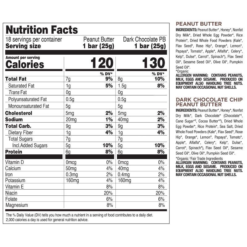 PEANUT BUTTER - Peanut Butter*, Honey*, Nonfat Dry Milk*, Dried Whole Egg Powder*, Rice Protein*, Dried Whole Food Powders (Kale*, Flax Seed*, Rose Hip*, Orange*, Lemon*, Papaya*, Tomato*, Apple*, Alf…