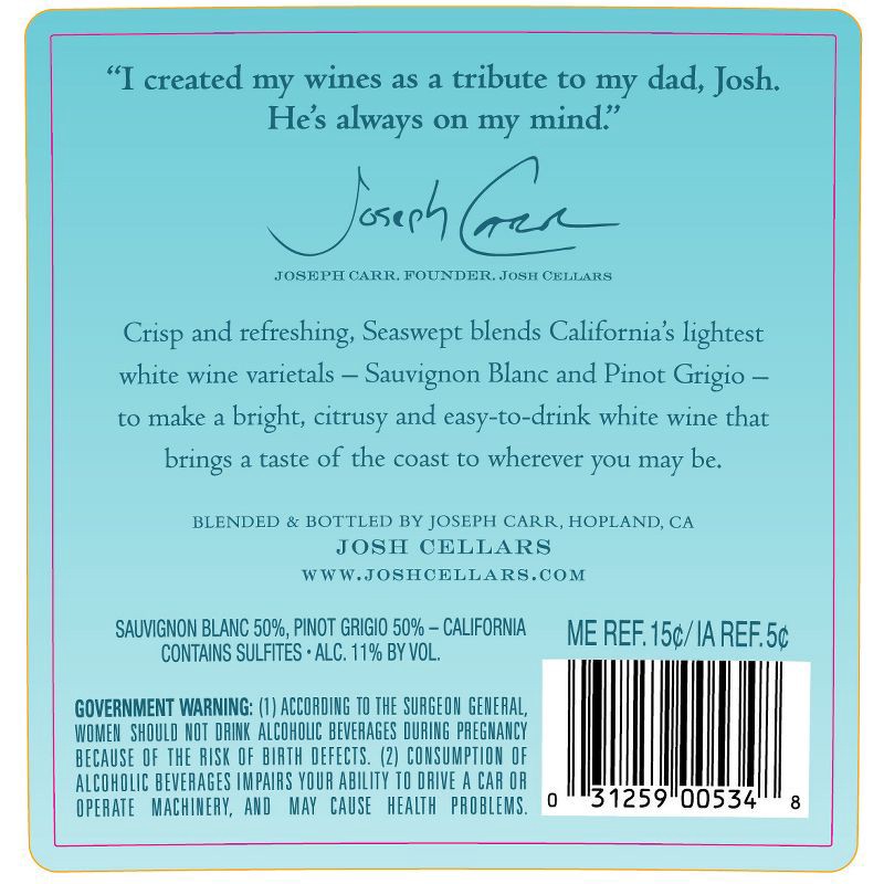 Josh Cellars Seaswept is a crisp new wine that's refreshing the rules. Seaswept combines California's lightest white varietals, Sauvignon Blanc and Pinot Grigio, for a bright, citrusy, easy-to-drink w…