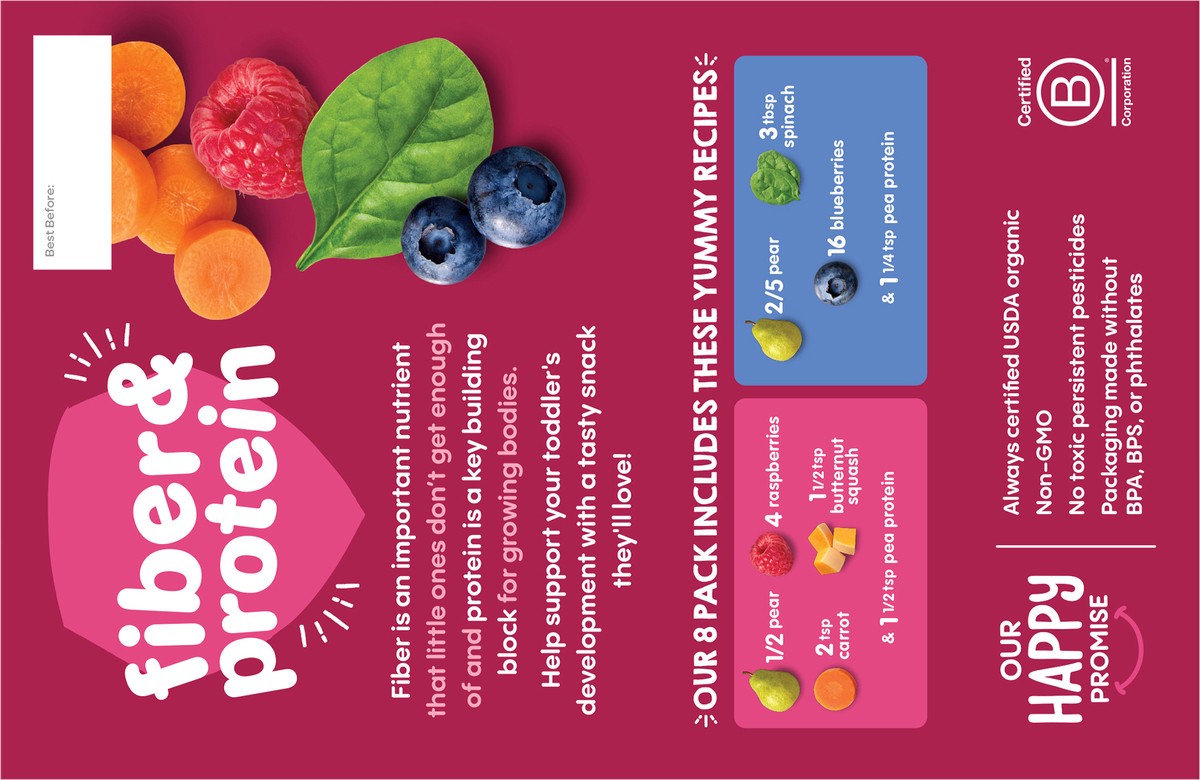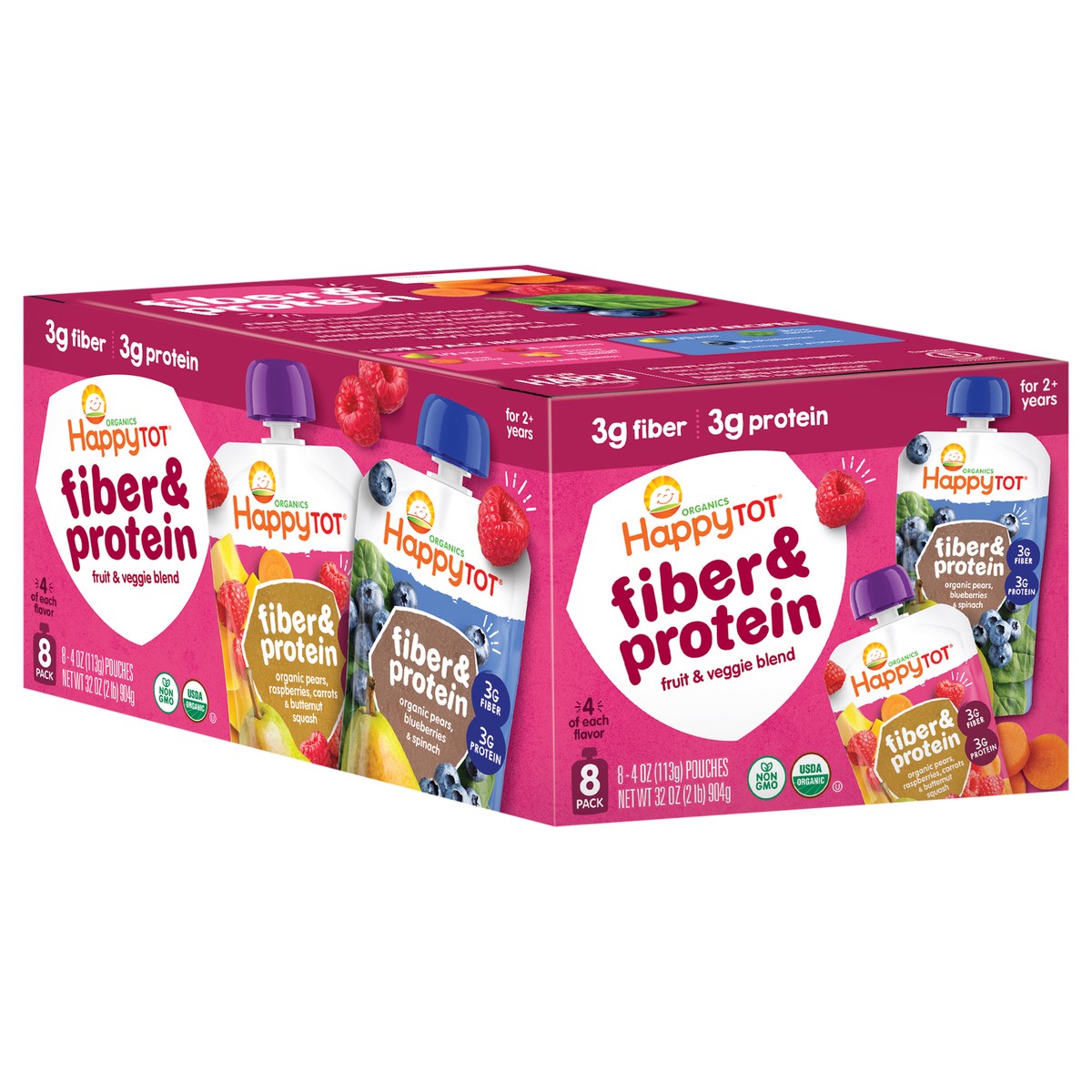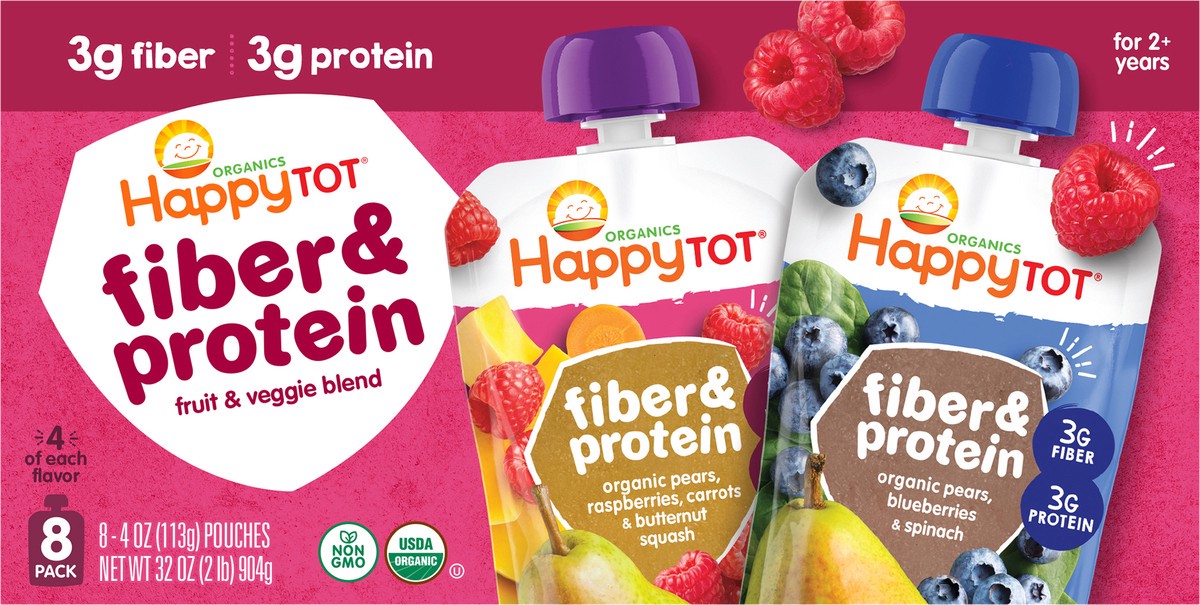 - For 2+ years3g fiber helps support digestive health3g protein helps support tot’s developing bodyIngredients selected for toddler’s age & stageCertified USDA Organic; Non-GMO Project Verified; Kosher; No artificial flavors