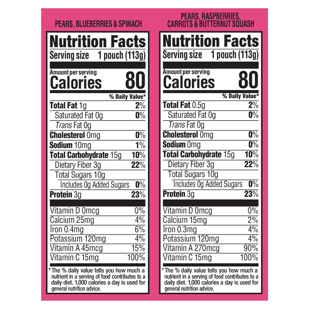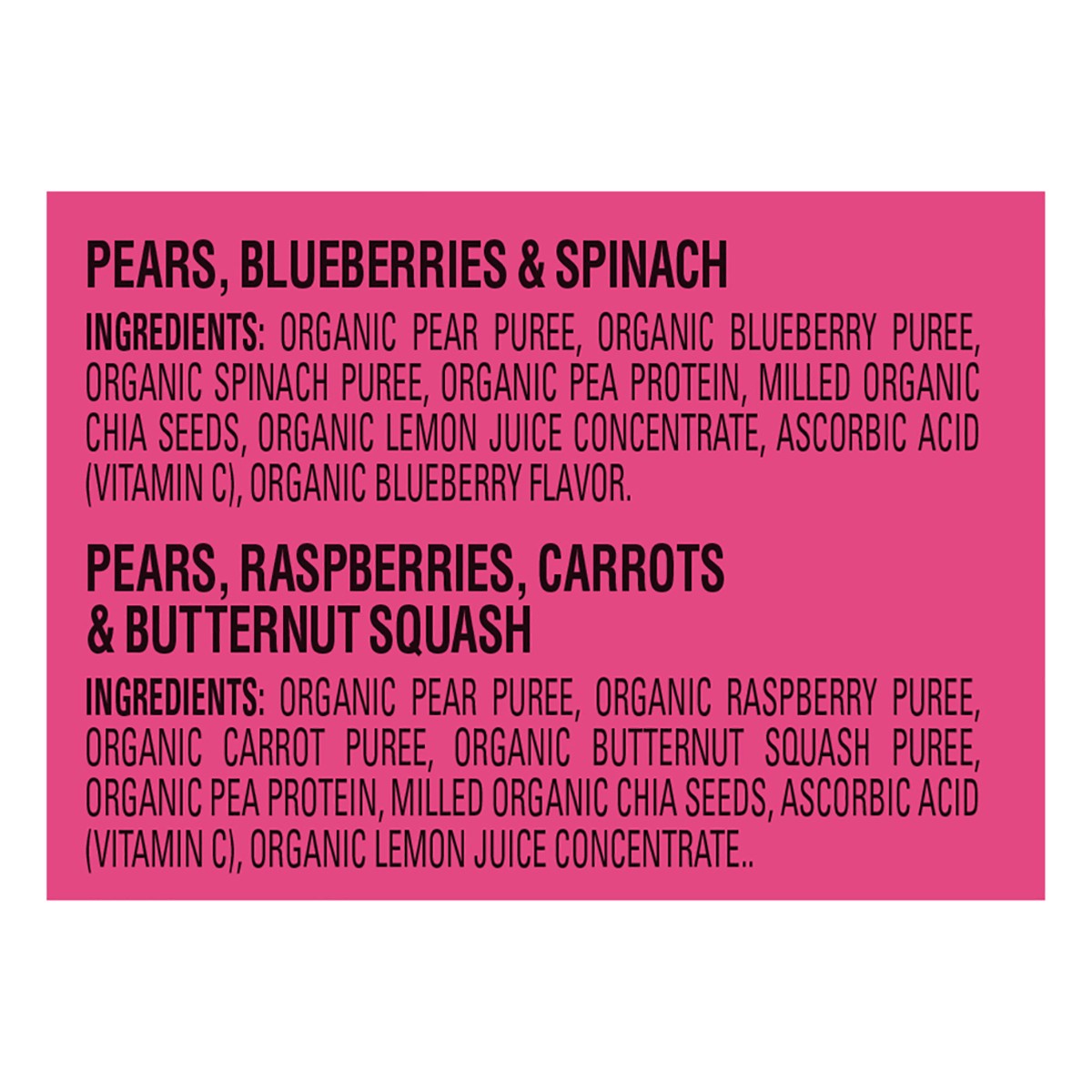 Pears, Blueberries & Spinach: Organic Pear Puree, Organic Blueberry Puree, Organic Spinach Puree, Organic Pea Protein, Milled Organic Chia Seeds, Organic Lemon Juice Concentrate, Ascorbic Acid (Vitami…