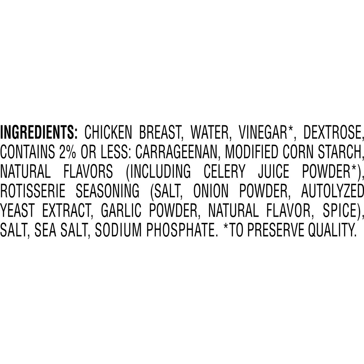 Chicken Breast, Water, Vinegar*, Dextrose, Contains 2% Or Less: Carrageenan, Modified Corn Starch, Natural Flavors (Including Celery Juice Powder*), Rotisserie Seasoning (Salt, Onion Powder, Autolyzed…