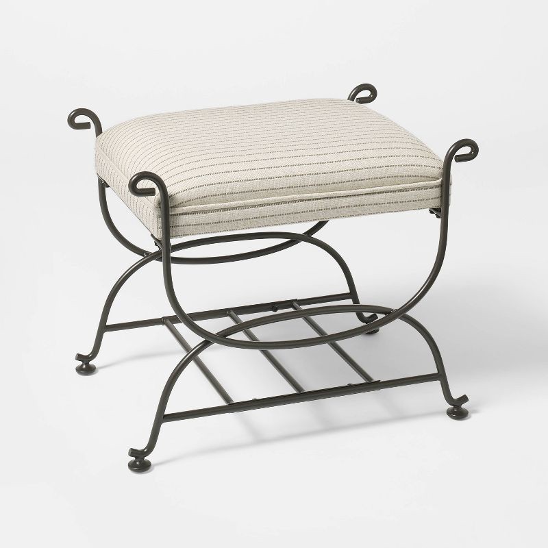 Add versatile seating and style to your space with this Metal Ottoman Performance Stripe Fabric from Threshold™ designed with Studio McGee. This upholstered ottoman features a dark metal frame with sc…