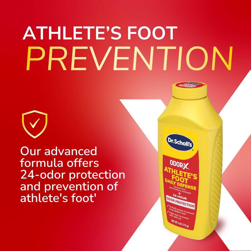 - DEFENDS AGAINST ATHLETE'S FOOT: Dr. Scholl's Odor-X Athlete's Foot Daily Defense Powder provides a simple daily option to help you prevent the condition effectively