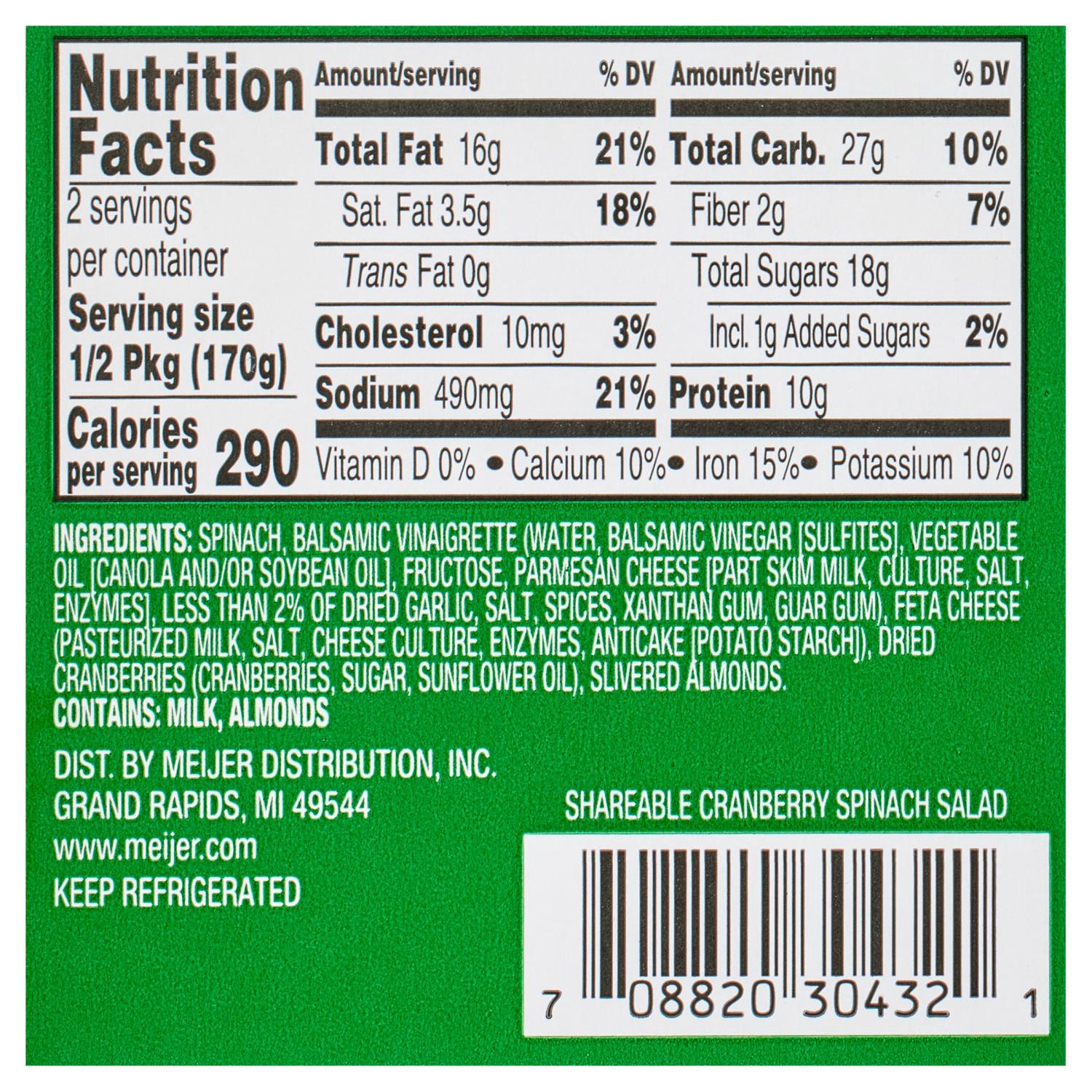 The Fresh from Meijer Shareable Cranberry Spinach Salad is a delightful mix of spinach, feta cheese, dried sweetened cranberries, and slivered almonds. It comes with a Balsamic Vinaigrette dressing th…