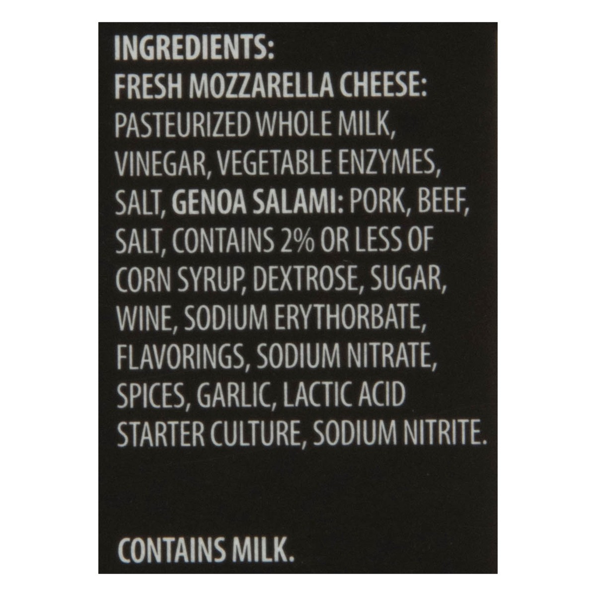 Fresh Mozzarella Cheese: Pasteurized Whole Milk, Vinegar, Vegetable Enzymes, Salt, Genoa Salami: Pork, Beef, Salt, Contains 2% or Less of Corn Syrup, Dextrose, Sugar, Wine, Sodium Erythorbate, Flavoriā¦