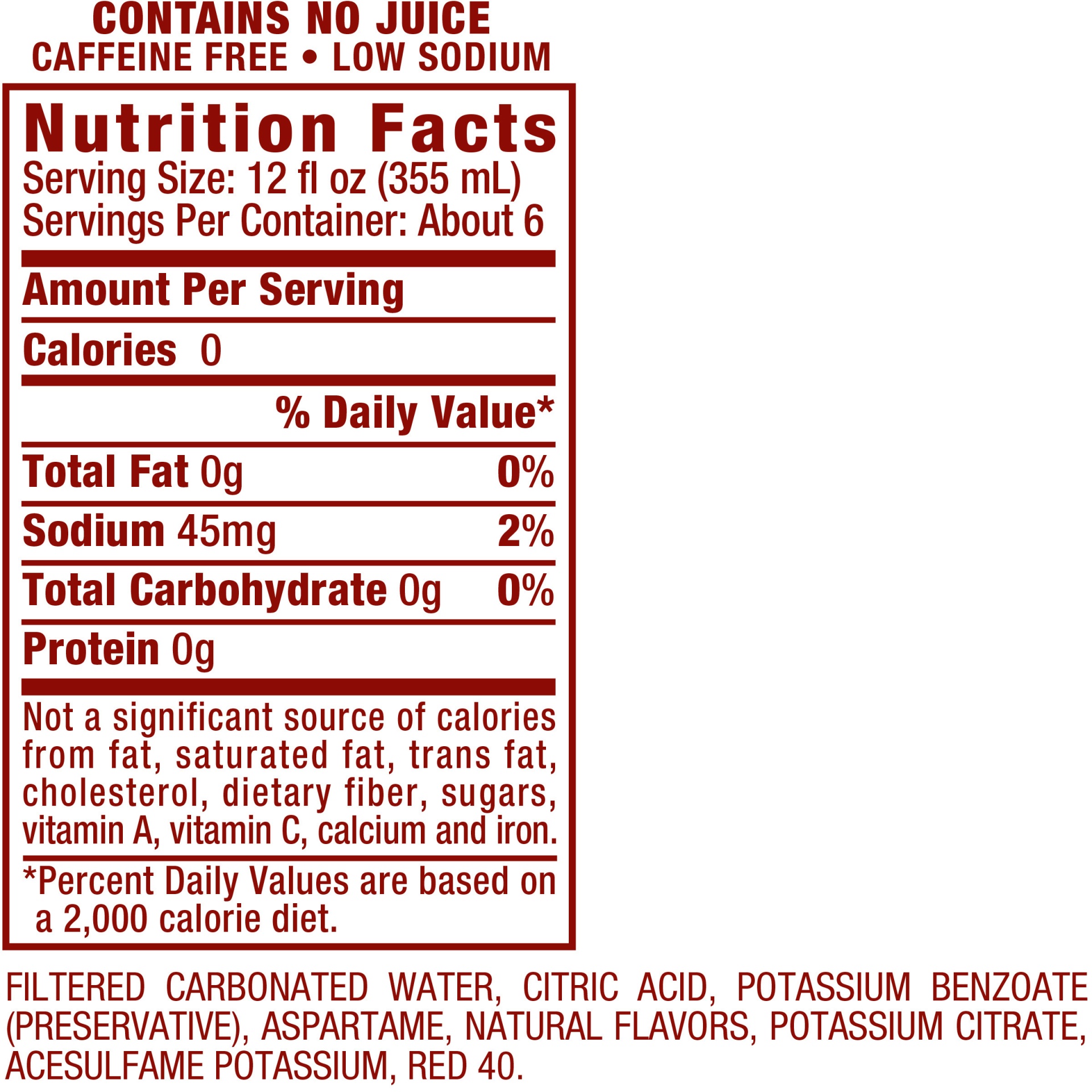 Filtered Carbonated Water, Citric Acid, Potassium Benzoate (Preservative), Aspartame, Potassium Citrate, Acesulfame Potassium, Natural Flavors, Red 40.
