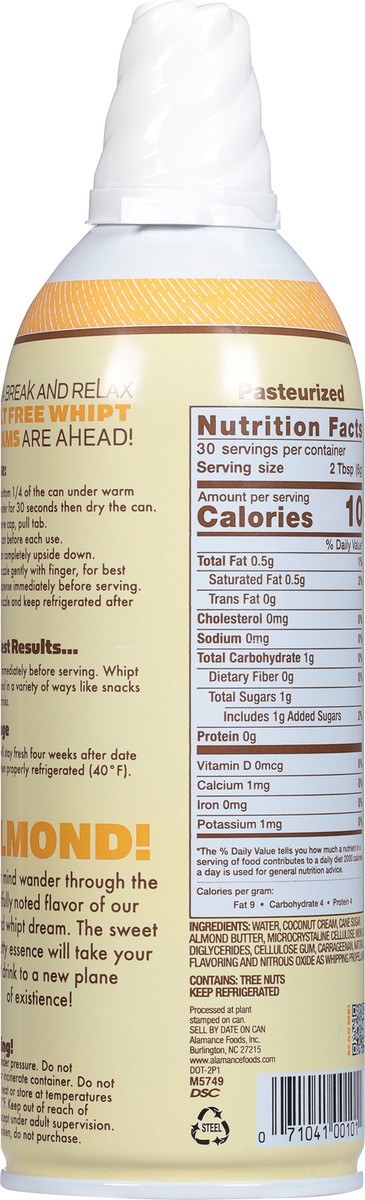 Water, Coconut Cream, Cane Sugar, Almond Butter, Microcrystalline Cellulose, Mono & Diglycerides, Cellulose Gum, Carrageenan, Natural Flavoring and Nitrous Oxide as Whipping Propellant.