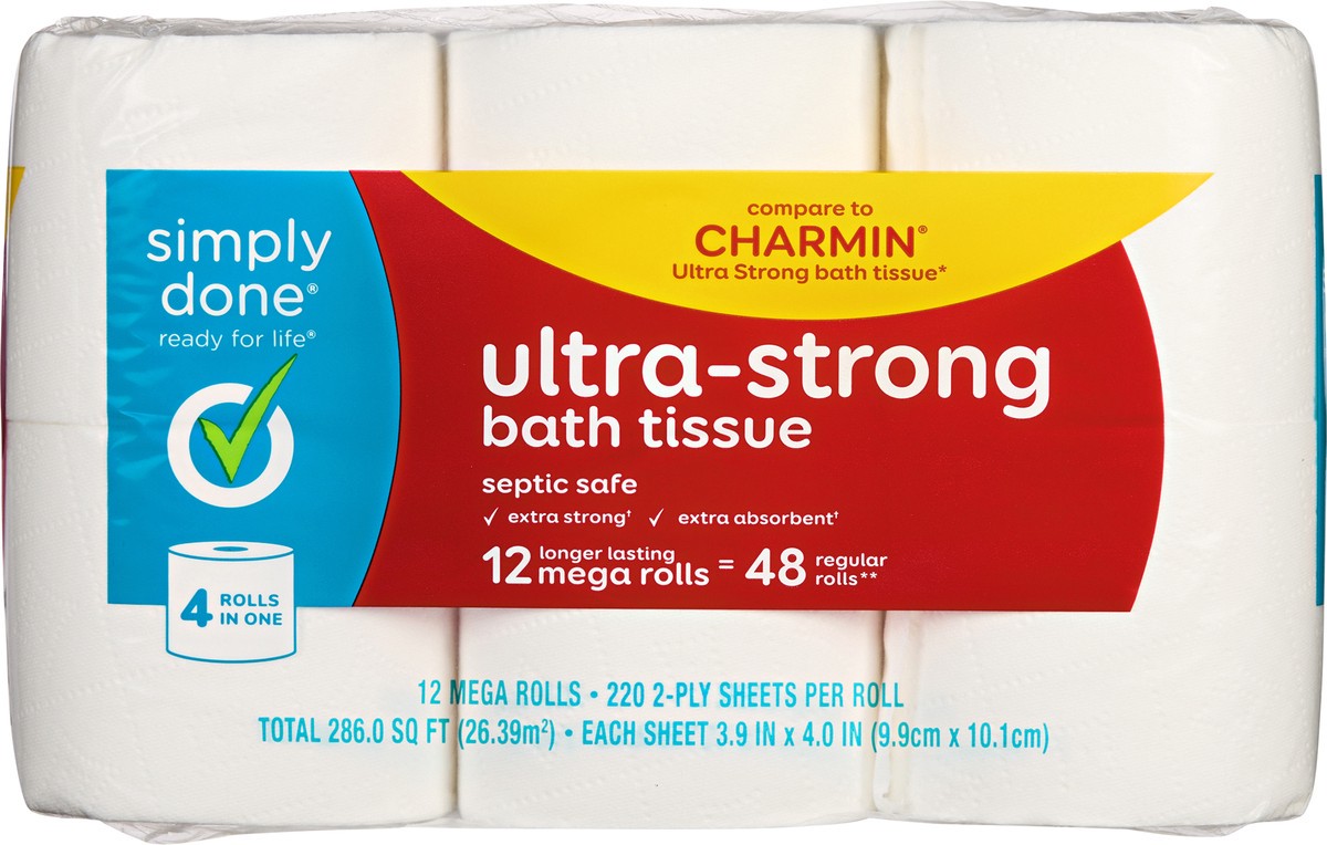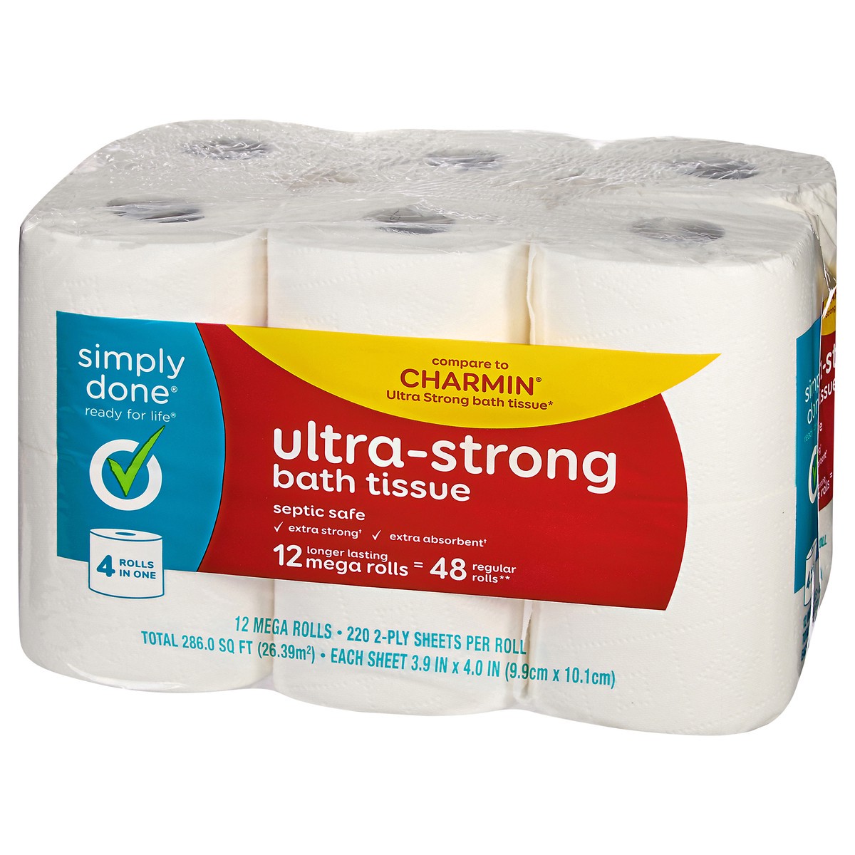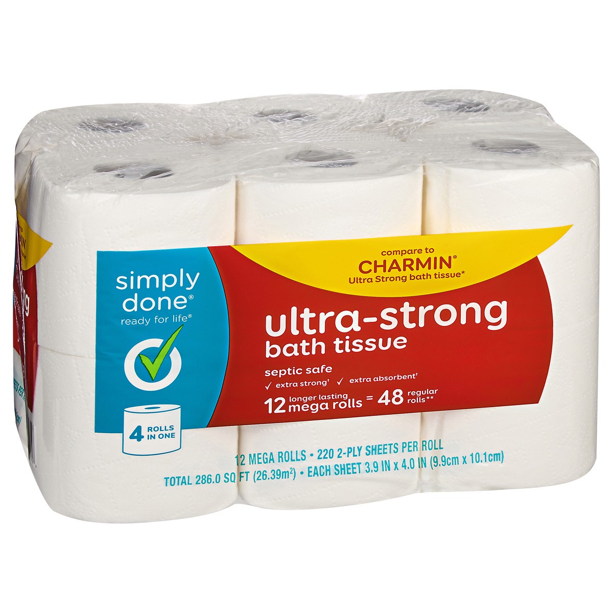 Each sheet 3.9 in x 4.0 in (9.9 cm x 10.1 cm). 220 1-ply sheets per roll. Total 286.0 sq ft (26.39 sq m). Ready for life. Compare to Charmin Ultra Strong bath tissue*. Septic safe. Extra strong(a). Ex…
