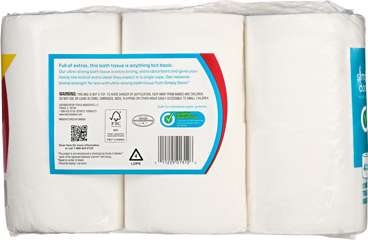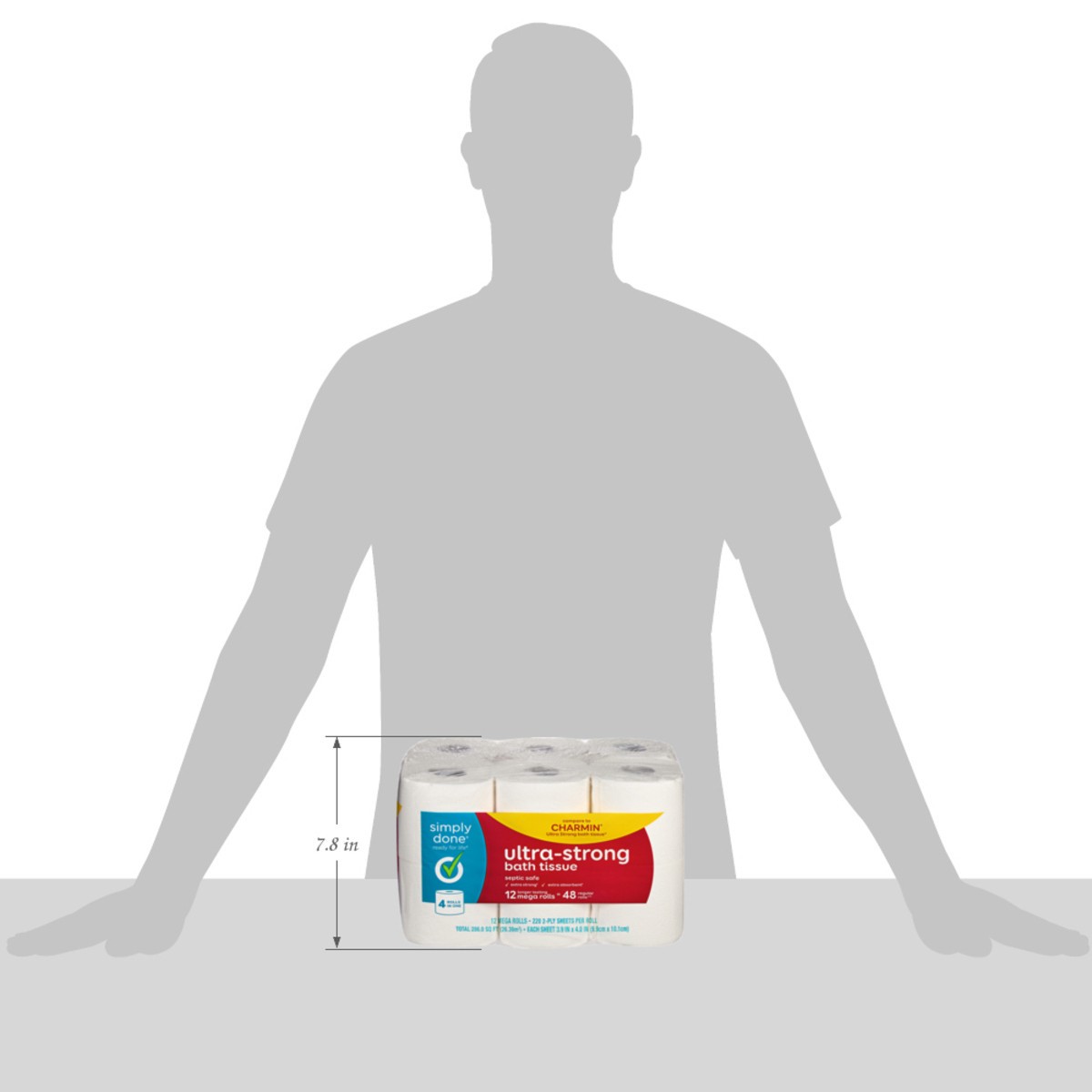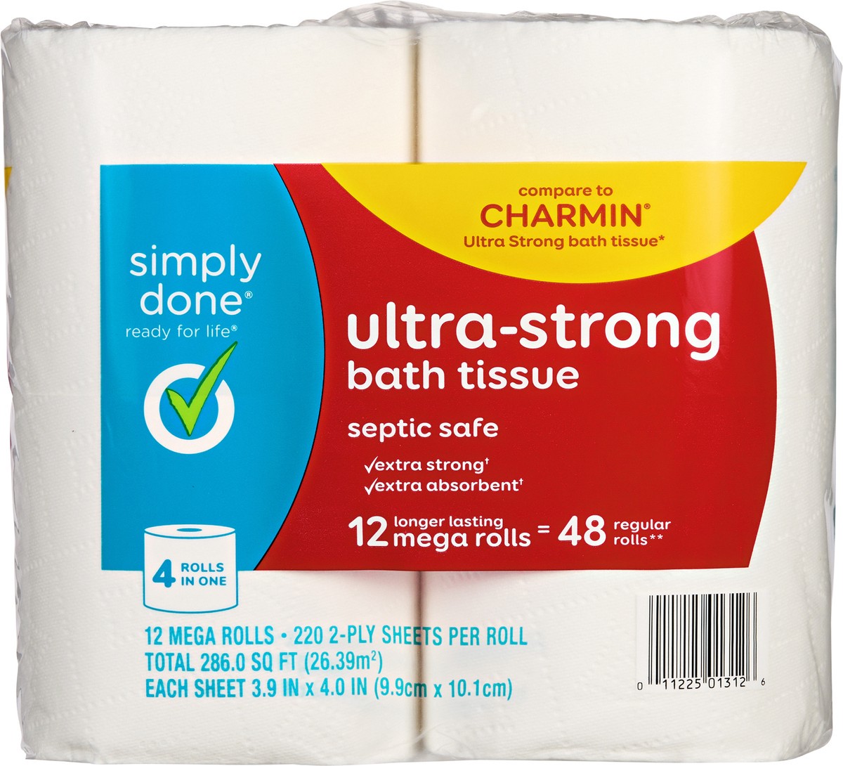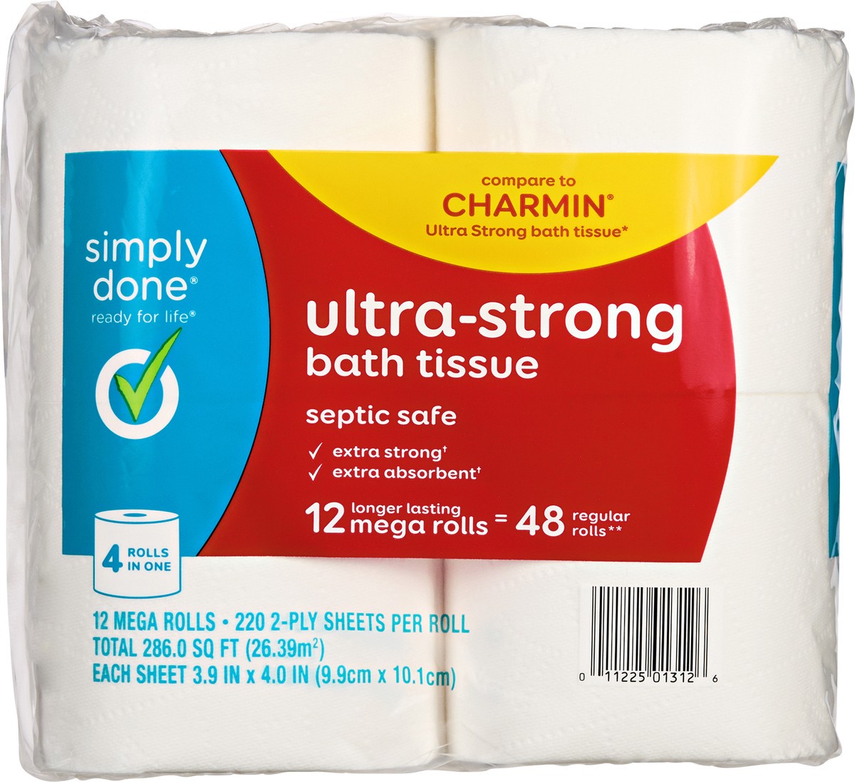 Each sheet 3.9 in x 4.0 in (9.9 cm x 10.1 cm). 220 1-ply sheets per roll. Total 286.0 sq ft (26.39 sq m). Ready for life. Compare to Charmin Ultra Strong bath tissue*. Septic safe. Extra strong(a). Ex…