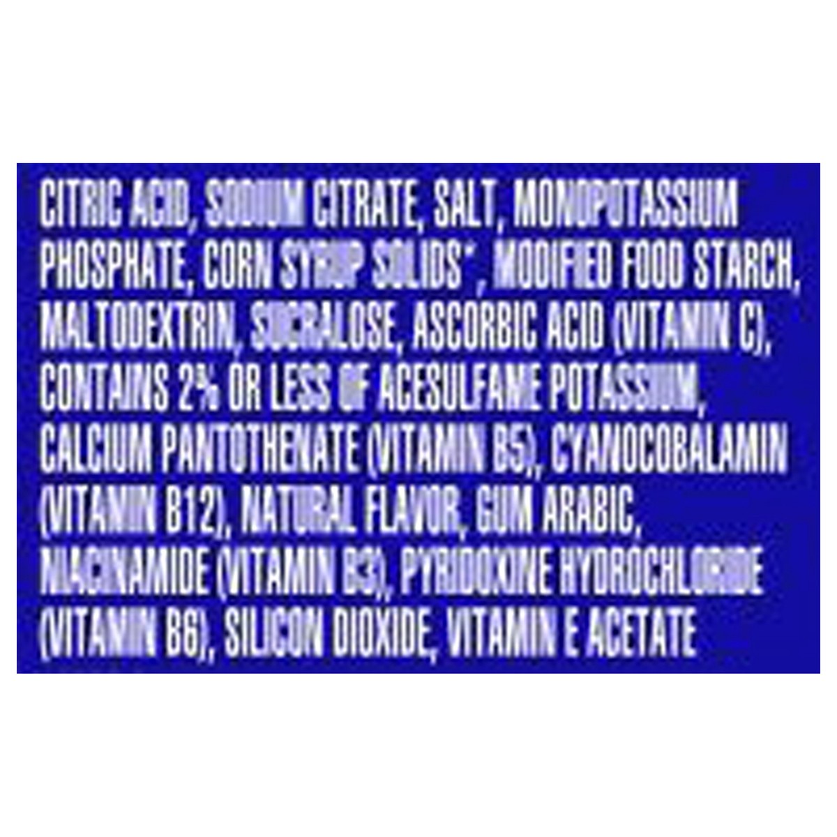 Citric Acid, Sodium Citrate, Salt, Monopotassium Phosphate, Corn Syrup Solids*, Modified Food Starch, Maltodextrin, Sucralose, Ascorbic Acid (Vitamin C), Contains 2% or Less of Acesulfame Potassium, C…
