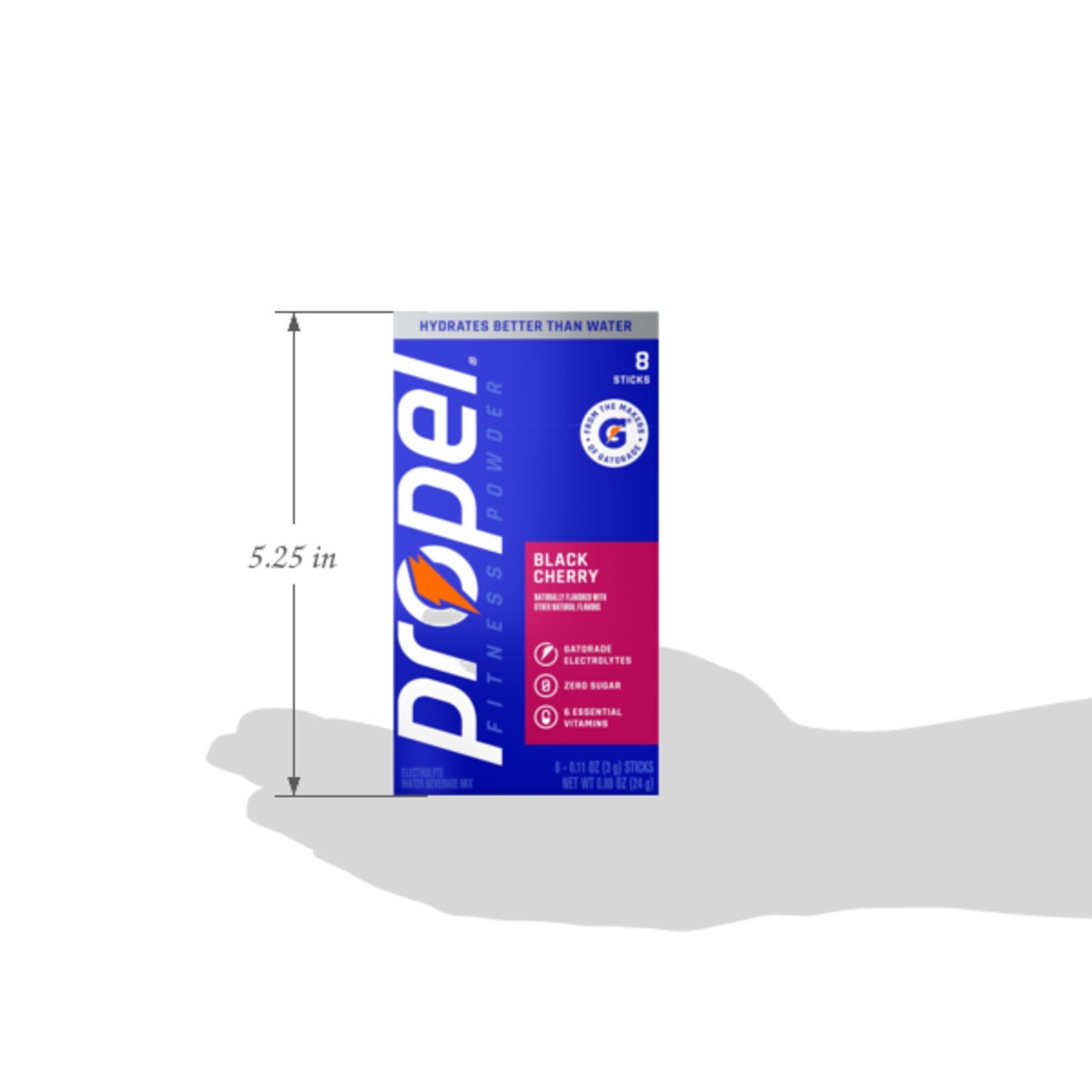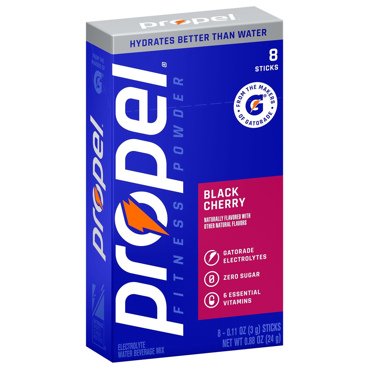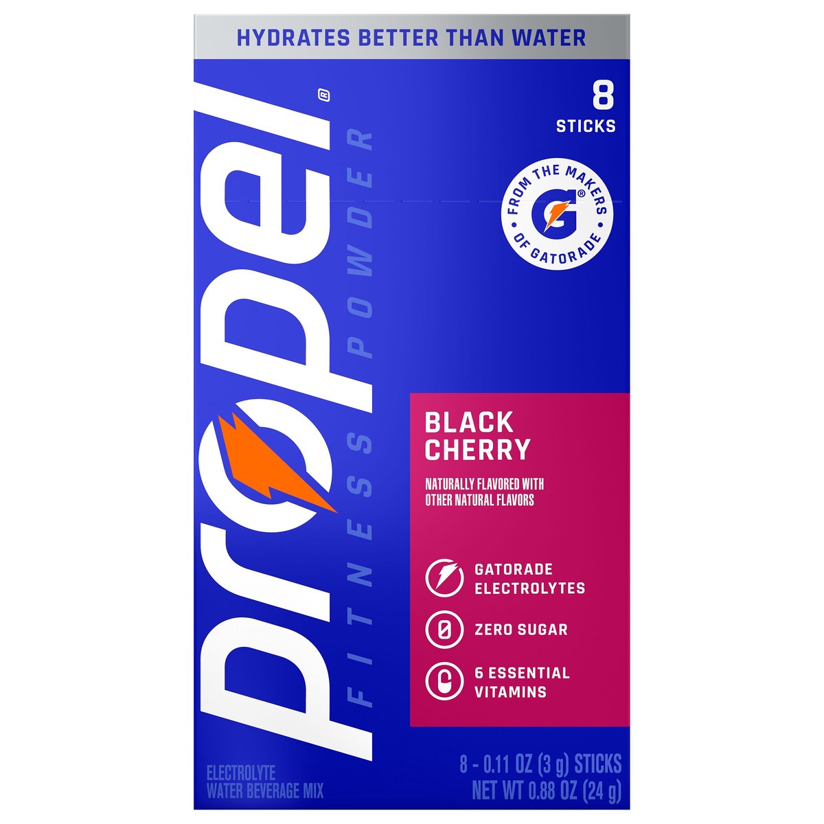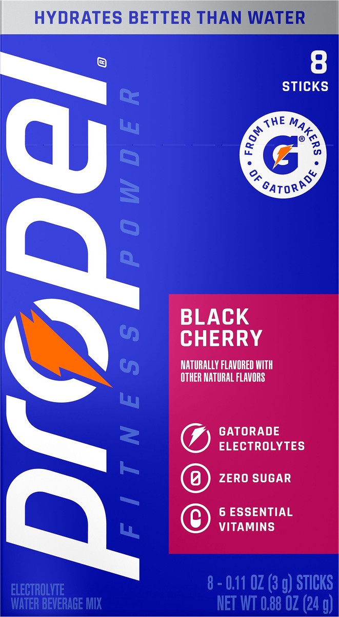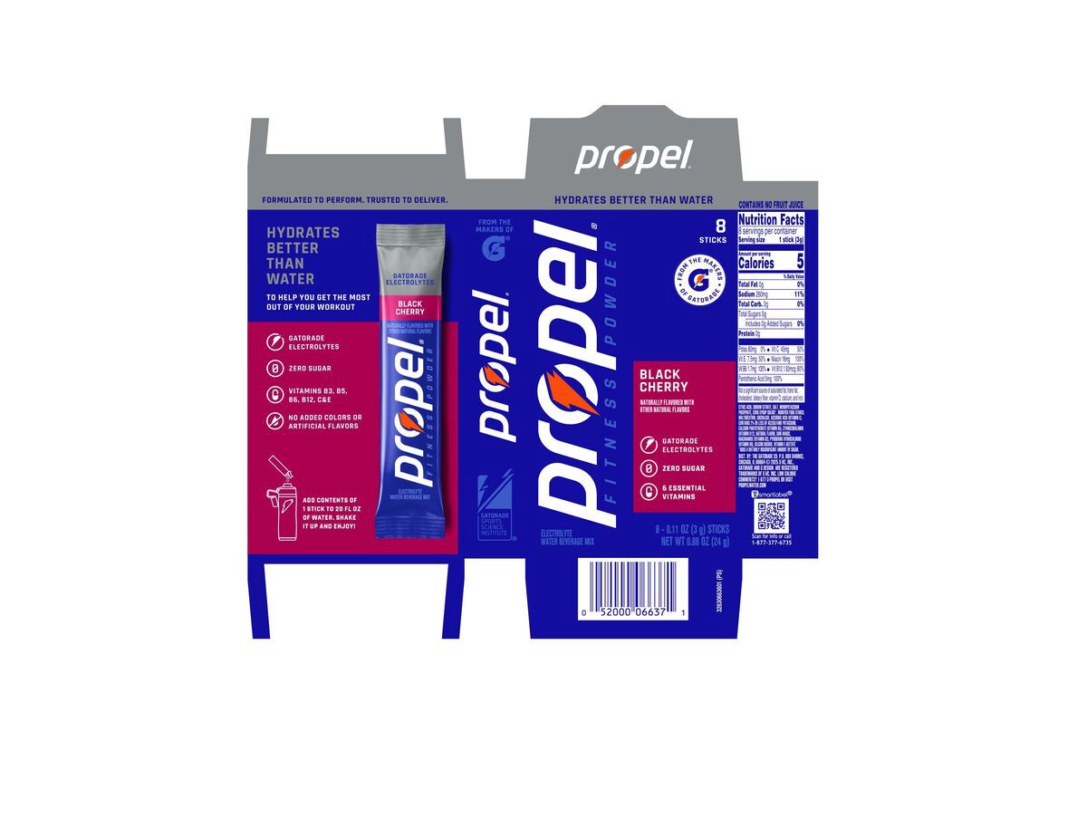 Hydrate better than water alone with Propel Fitness Powder Black Cherry Stick Packs. They contain Gatorade electrolytes, 6 essential vitamins and zero sugar. Simply mix powder with 20 oz of water in a…