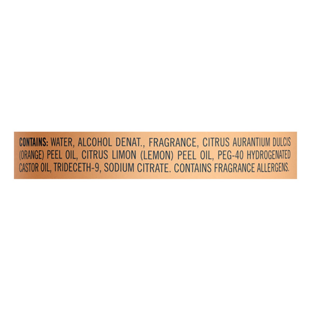 Contains: Water, Alcohol Denal, Fragrance, Citrus Aurantium Dulcis (Orange) Peel Oil, Citrus Limon (Lemon) Peel Oil, PEG-40 Hydrogenated Castor Oil, Trideceth-9, Sodium Citrate.