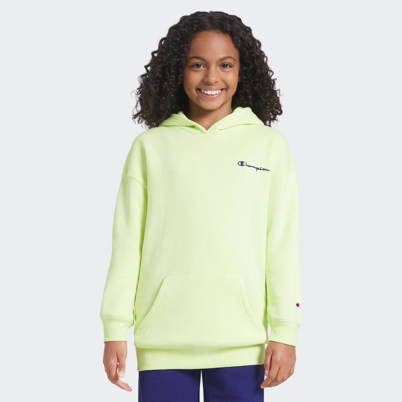 The Champion® Girls' Fleece Oversized Graphic Hoodie is a cute essential for her warderobe. Crafted from a thick cotton blend, this gilrs' fleece hoodie is warm and cozy. Broadcasting Champion® logos …