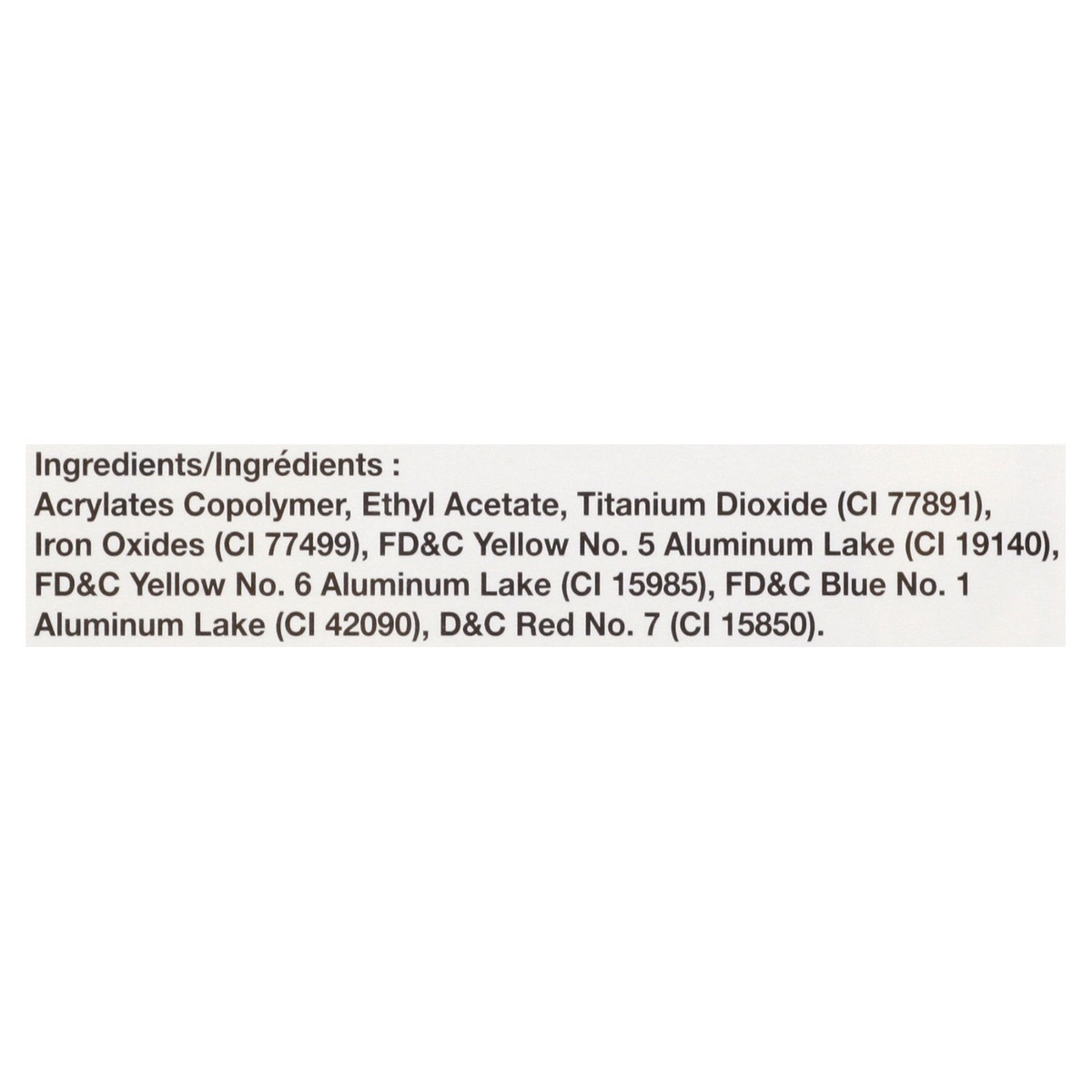 Acrylates Copolymer, Ethyl Acetate, Titanium Dioxide (CI 77891), Iron Oxides (CI 77499), FD&C Yellow 5 Aluminum Lake (CI 19140) FD&C Yellow 6 Aluminum Lake (CI 15985), FD&C Blue 1 Aluminum Lake (CI 42…