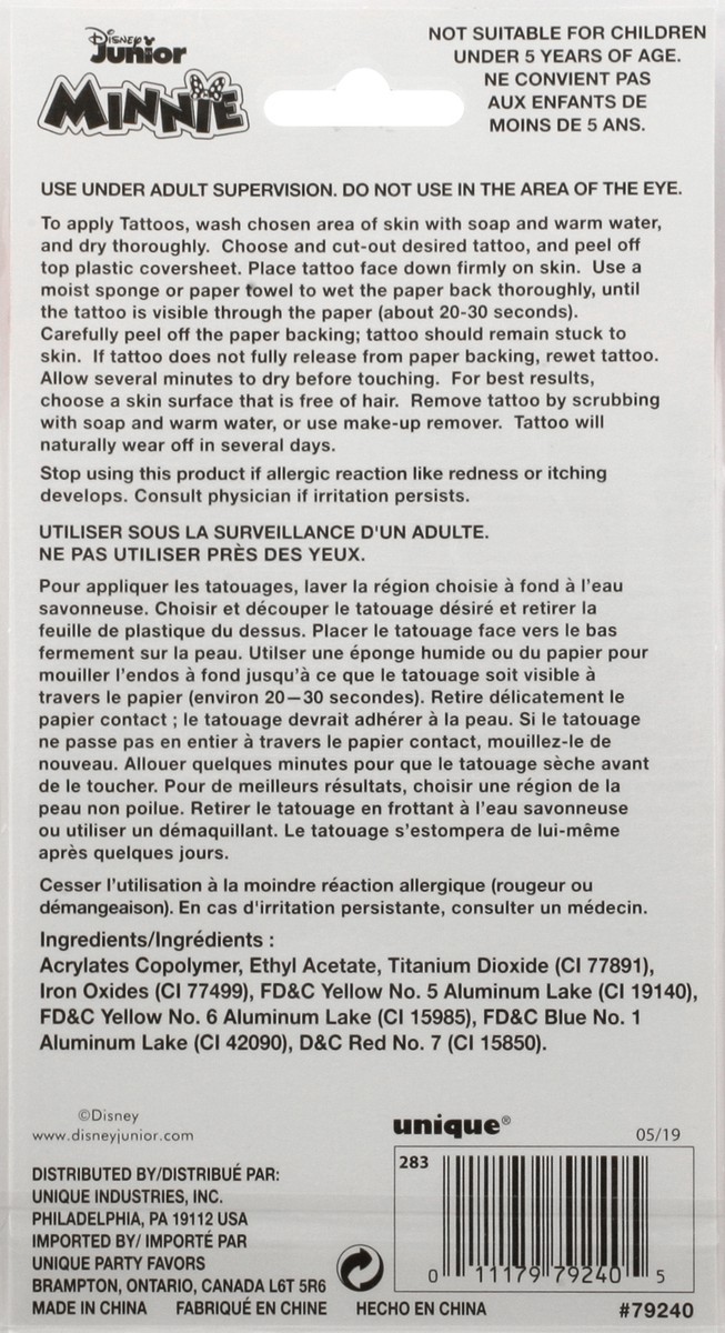 5+. 4 sheets. Package total: 24 tattoos. www.disneyjunior.com. Made in China.