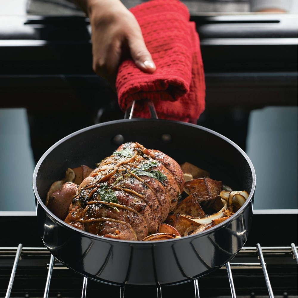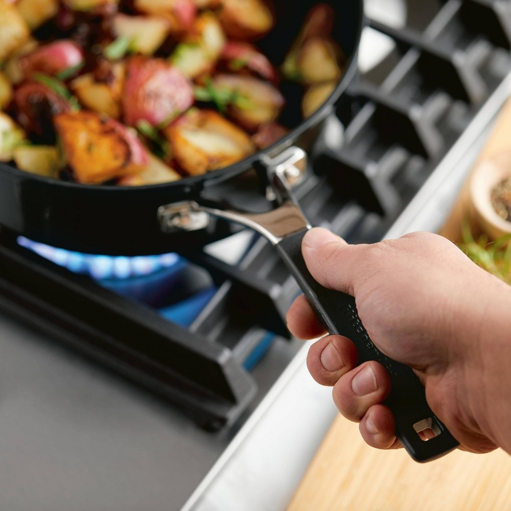Enjoy crafting meals and signature dishes with the KitchenAid Hard Anodized Nonstick Saute Pan with Lid. Featuring a thick, forged aluminum base to provide quick heat distribution, while thinner side …