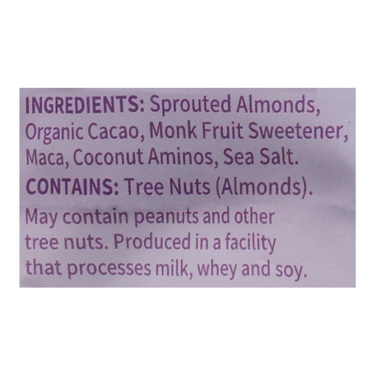 Sprouted Almonds, Cacao Mix (Dutched Cocoa Powder, Organic Cocoa Butter, Water), Organic Coconut Sugar, Maca Powder, Vanilla, Sea Salt.
