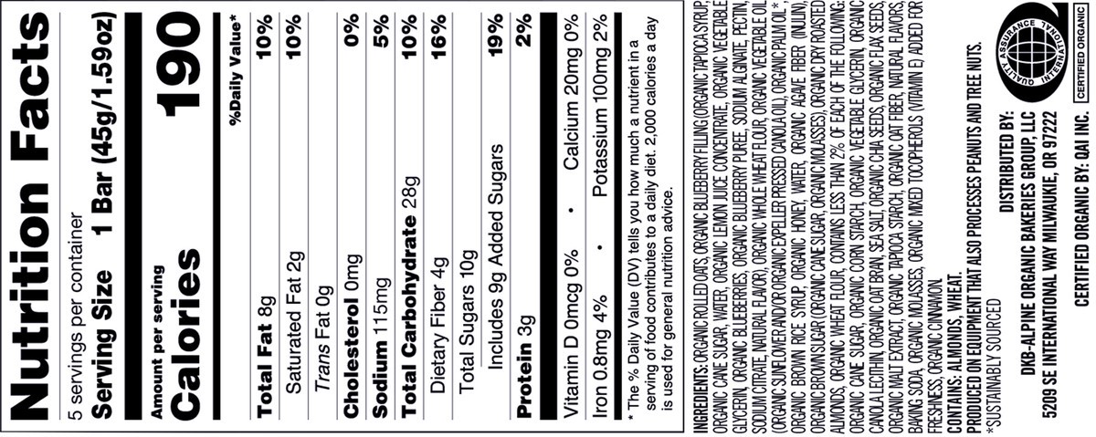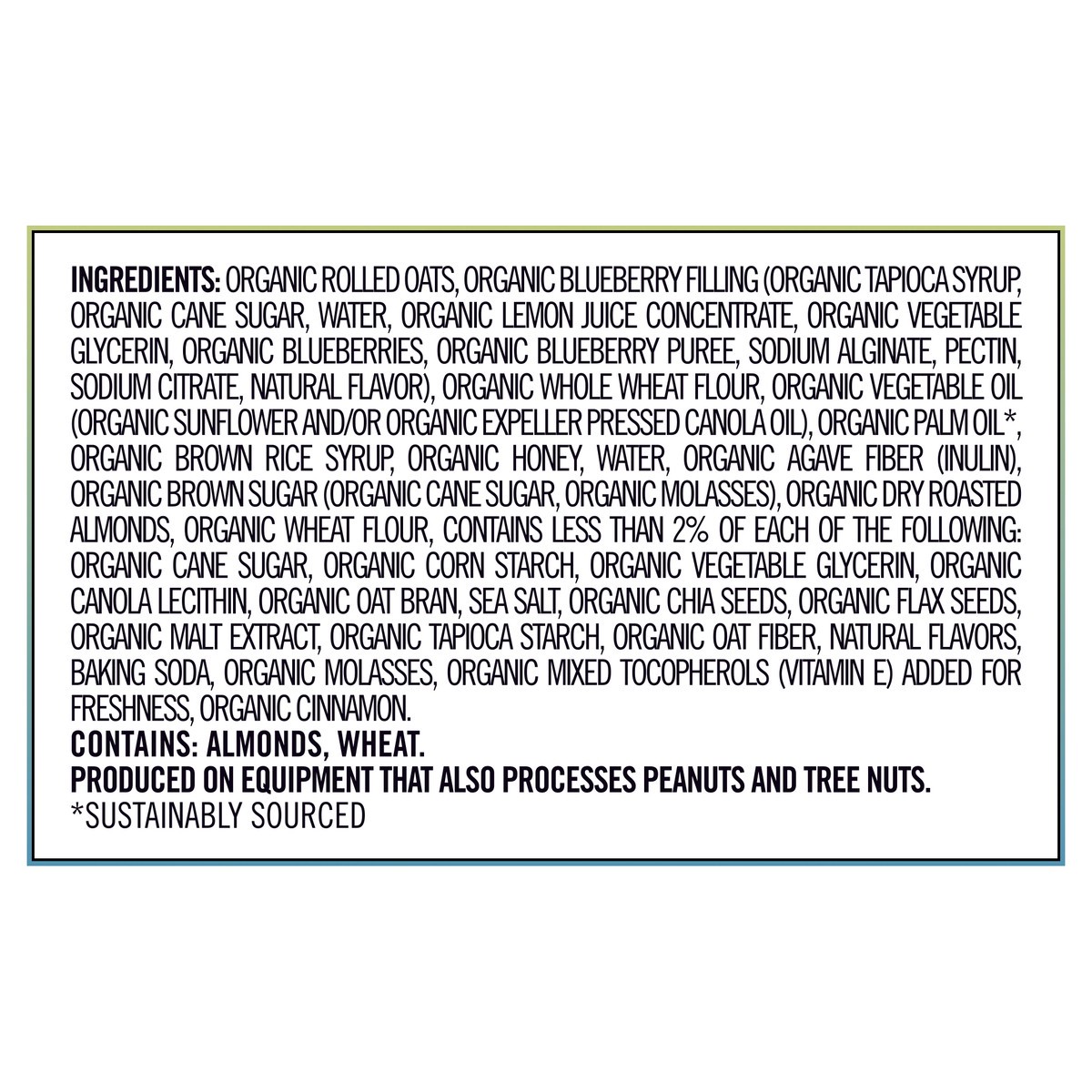 Organic Rolled Oats, Organic Blueberry Filling (Organic Tapioca Syrup, Organic Cane Sugar, Water, Organic Lemon Juice Concentrate, Organic Vegetable Glycerin, Organic Blueberries, Organic Blueberry Pu…
