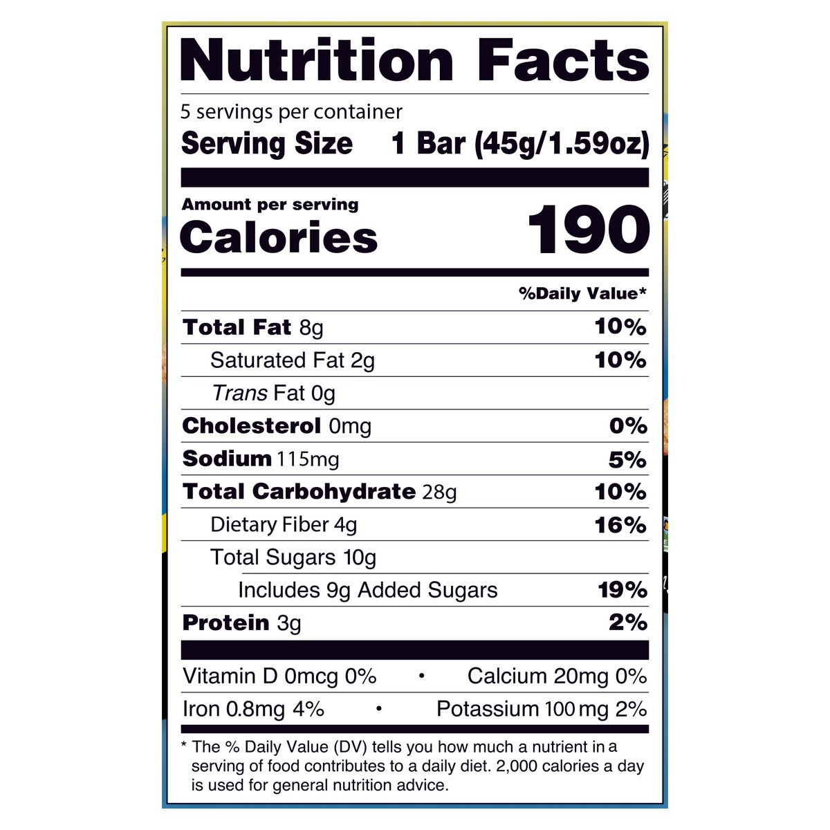 - 3g protein (2% daily value), 4g fiber, 15g whole grains per bar
