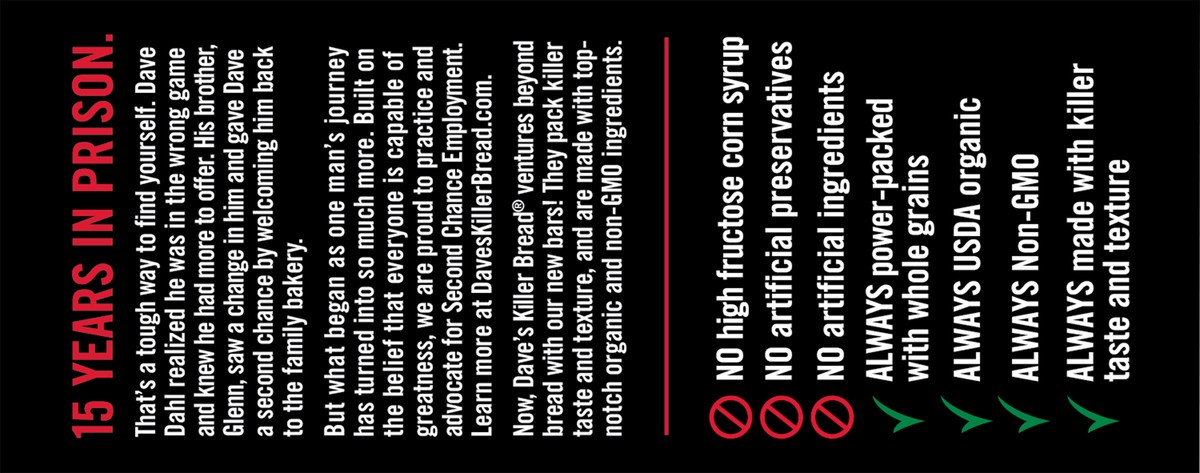 - Dave''s Killer Bread Bars are Non-GMO Project Verified and USDA Organic Certified, plus has no high-fructose corn syrup, artificial preservatives or artificial ingredients