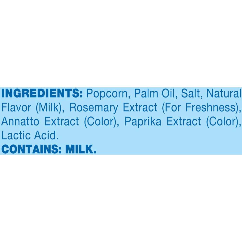 INGREDIENTS: POPCORN, PALM OIL, SALT, NATURAL FLAVOR (MILK), ROSEMARY EXTRACT (FOR FRESHNESS), ANNATTO EXTRACT (COLOR), PAPRIKA EXTRACT (COLOR), LACTIC ACID. CONTAINS: MILK