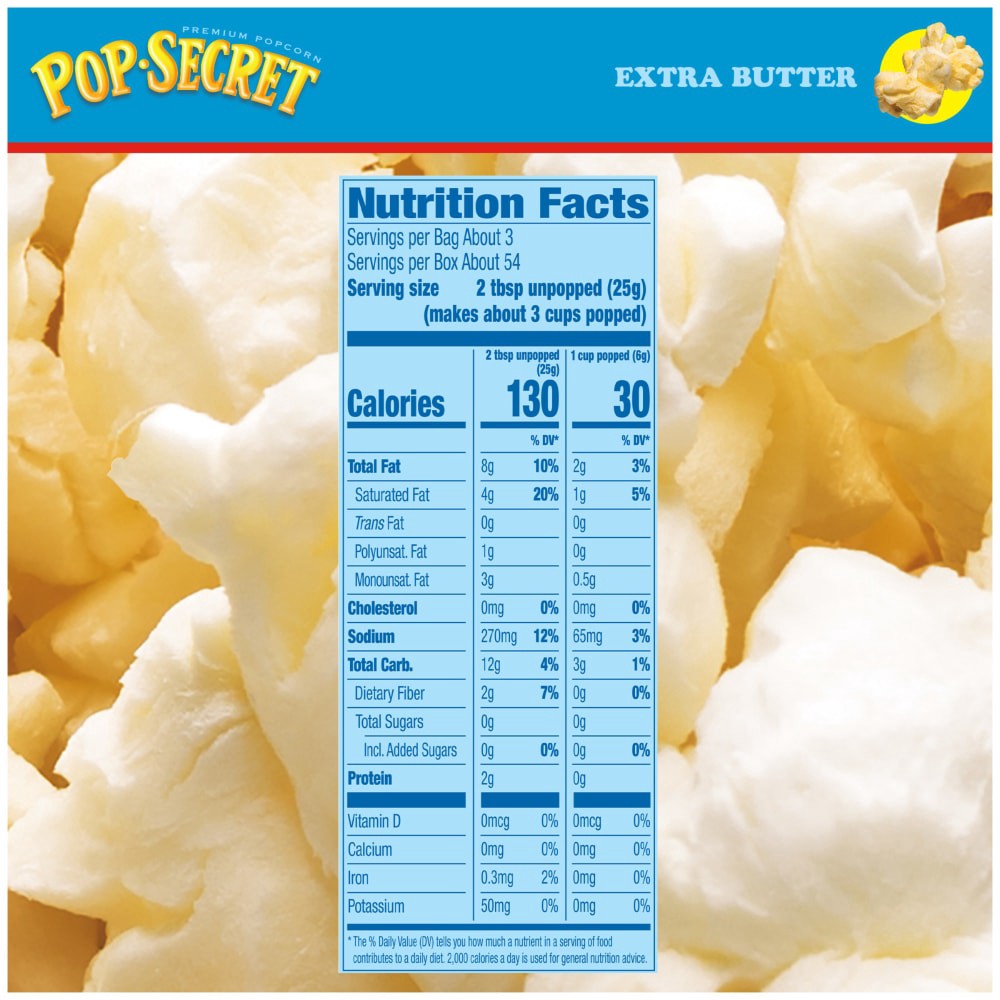 Pop Secret Extra Butter Flavor popcorn is the next level in buttery flavor. What''s our secret for the best popcorn? Kernels popped up light and fluffy with delicious buttery flavor and an aroma that …