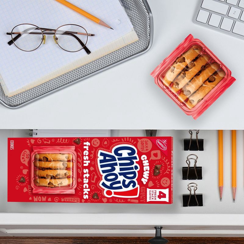 - One 8.66 oz box with four fresh stacks of Chewy CHIPS AHOY! Chocolate Chip Cookies, 4 cookies per pack (packaging may vary)