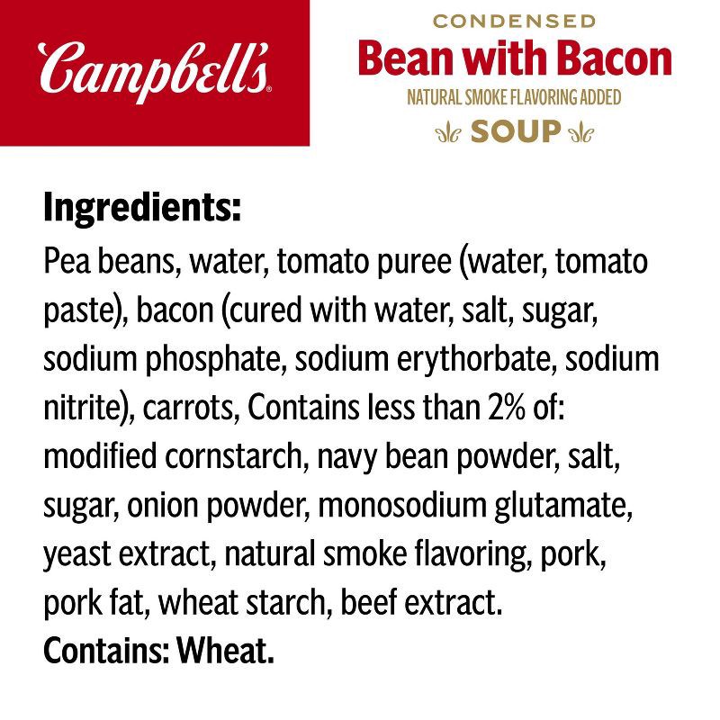 Campbell's Bean With Bacon Soup brings comfort to every spoonful. Made with tomato puree, beans, bacon and carrots, with natural smoke flavoring, it's the kind of soup that warms both body and soul. T…
