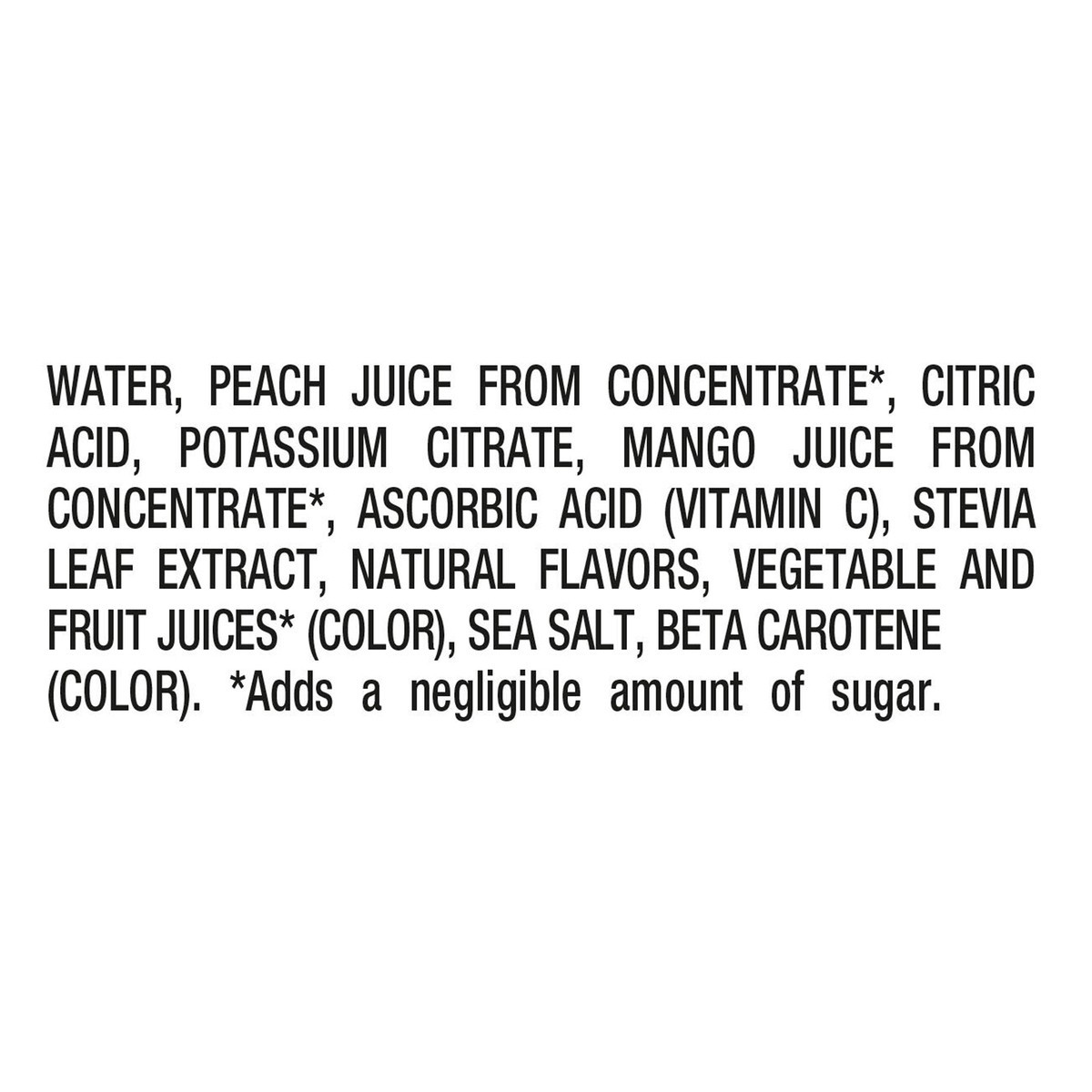 Water, Peach Juice from Concentrate*, Citric Acid, Potassium Citrate, Mango Juice from Concentrate*, Ascorbic Acid (Vitamin C), Stevia Leaf Extract, Natural Flavors, Vegetable and Fruit Juices* (Color…