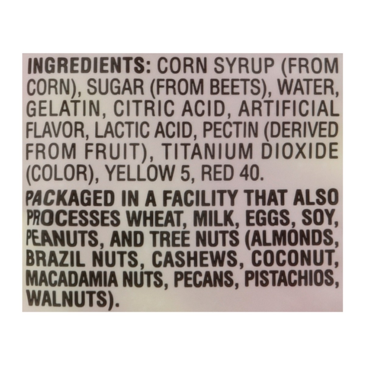 Corn Syrup (from Corn), Sugar (from Beets), Water, Gelatin, Citric Acid, Artificial Flavor, Lactic Acid, Pectin (Derived from Fruit), Titanium Dioxide (Color), Yellow 5, Red 40.