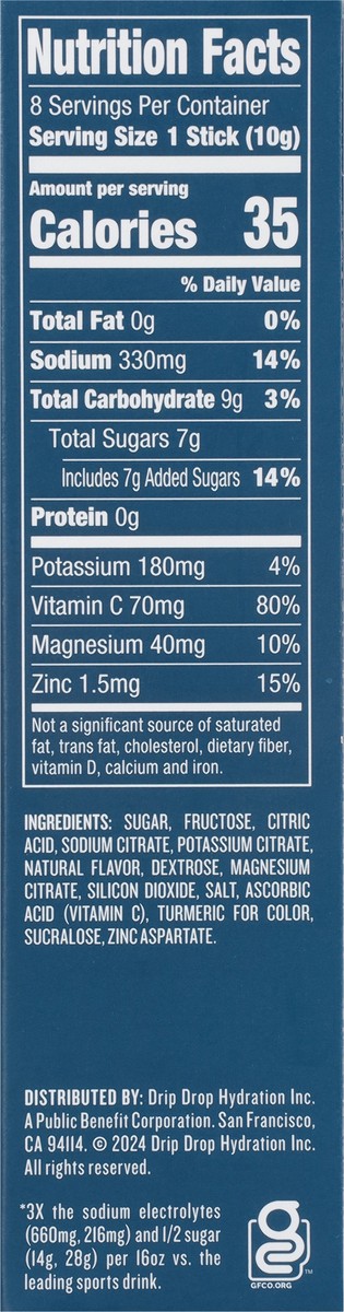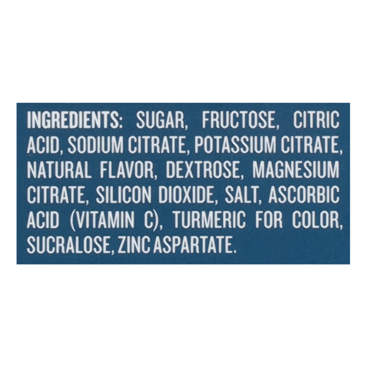 Sugar, Fructose, Citric Acid, Sodium Citrate, Potassium Citrate, Natural Flavor, Dextrose, Magnesium Citrate, Silicon Dioxide, Salt, Ascorbic Acid (Vitamin C), Turmeric for Color, Sucralose, Zinc Aspa…
