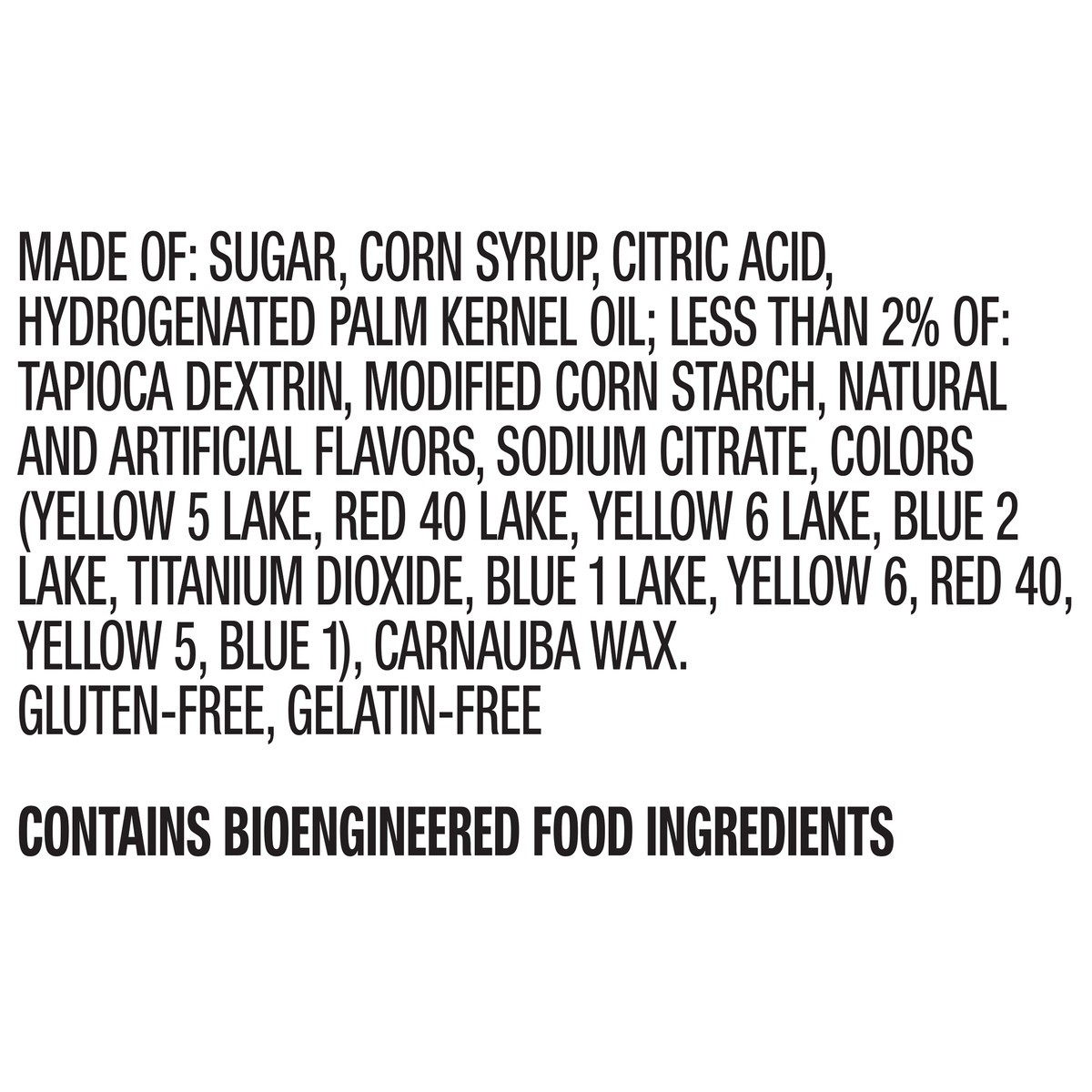 Made of: Sugar, Corn Syrup, Citric Acid, Hydrogenated Palm Kernel Oil; Less than 2% of: Tapioca Dextrin, Modified Corn Starch, Natural and Artificial Flavors, Sodium Citrate, Colors (Yellow 5 Lake, Re…