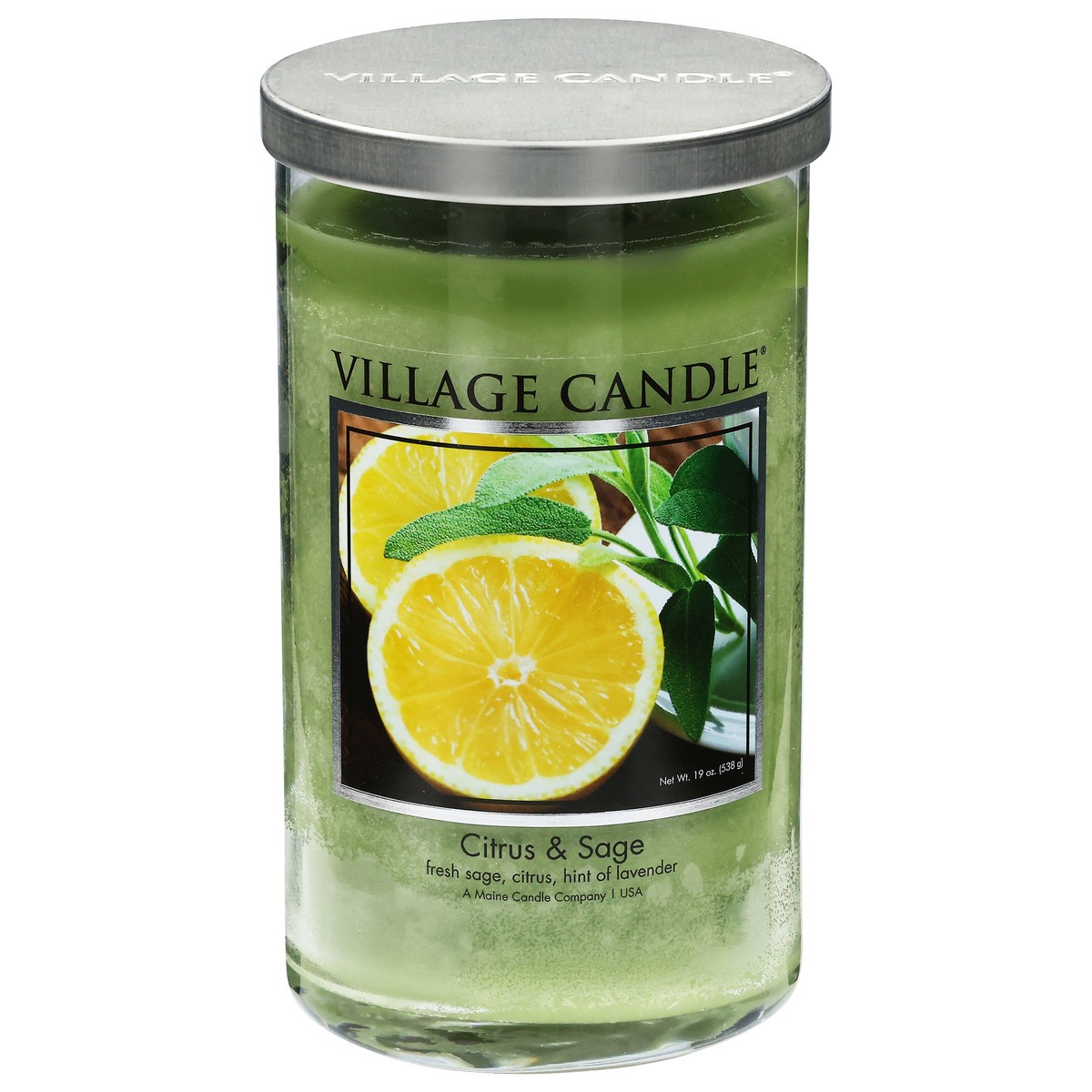 24 fl oz. Fresh sage, citrus, with a hint of lavender. Approx. burn time is up to 110 hours. www.villagecandle.com. Made in Wells, Maine, USA.