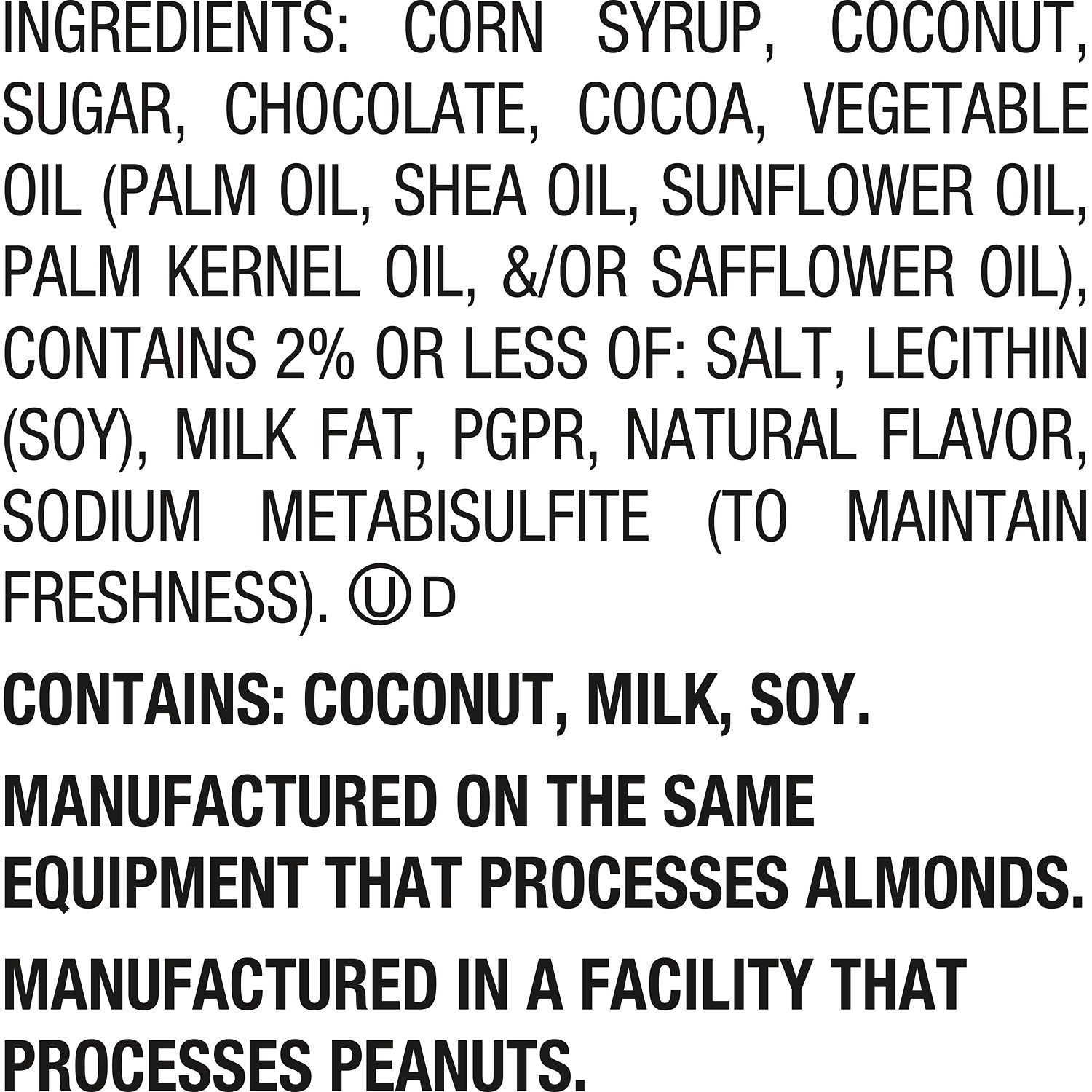 CORN SYRUP, COCONUT, SUGAR, CHOCOLATE, COCOA, VEGETABLE OIL (PALM OIL, SHEA OIL, SUNFLOWER OIL, PALM KERNEL OIL, &/OR SAFFLOWER OIL), CONTAINS 2% OR LESS OF: SALT, LECITHIN (SOY), MILK FAT, PGPR, …