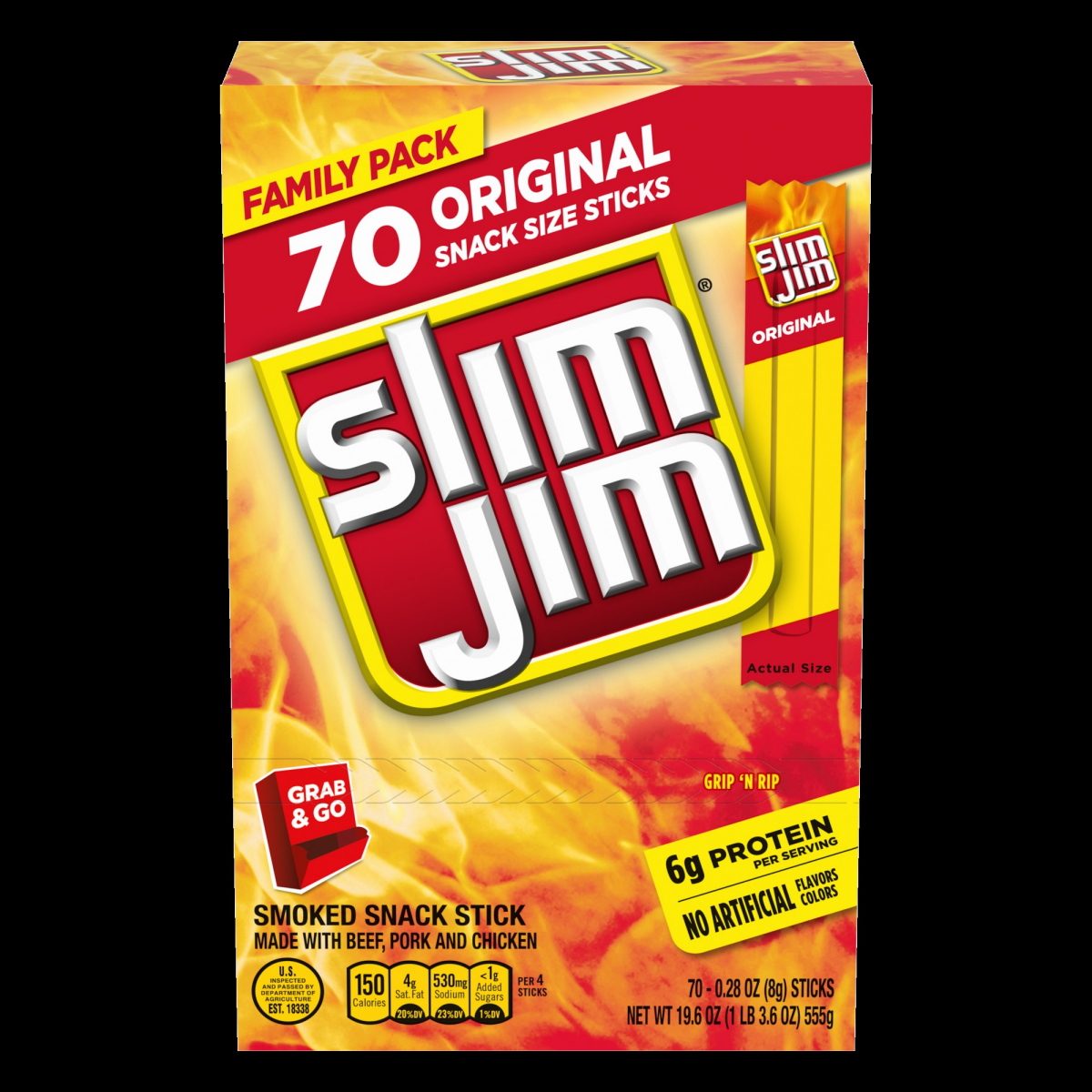 - One 70-count box of 0.28 oz. Slim Jim Original Snack Size Smoked Meat Sticks