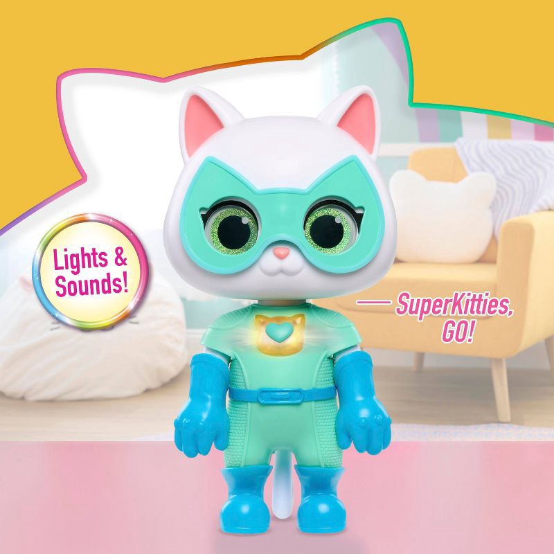 - One Cool Kitten: When the sweet white kitty is posed in her full 8-inch-tall standing height, add her SuperKitties outfit, gloves, mask, and boots to see her transformation.